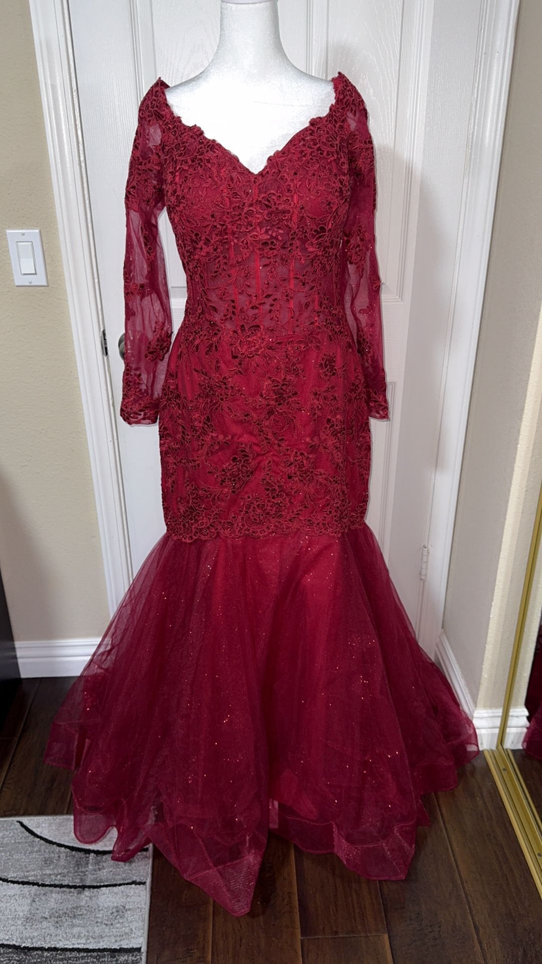 mermaid style burgundy dress brand new never used. It can be used for prom or special event even a quinceanera if you want a more simple dress. It’s adjustable from the back since the mannequin has a smaller waist. The back was tighten, but can be adjusted from the back for wider figure if you’re a size large extra large, it can also fit it all depends on body figure sleeves are not too tight so it’s breathable and also have elastic strings to hold up the sleeves Dress was 900 letting for 650 or you can also shoot a reasonable offer if you’re interested and would like to try it on let me know If nearby, we can meet up, or there’s also option for shipping.