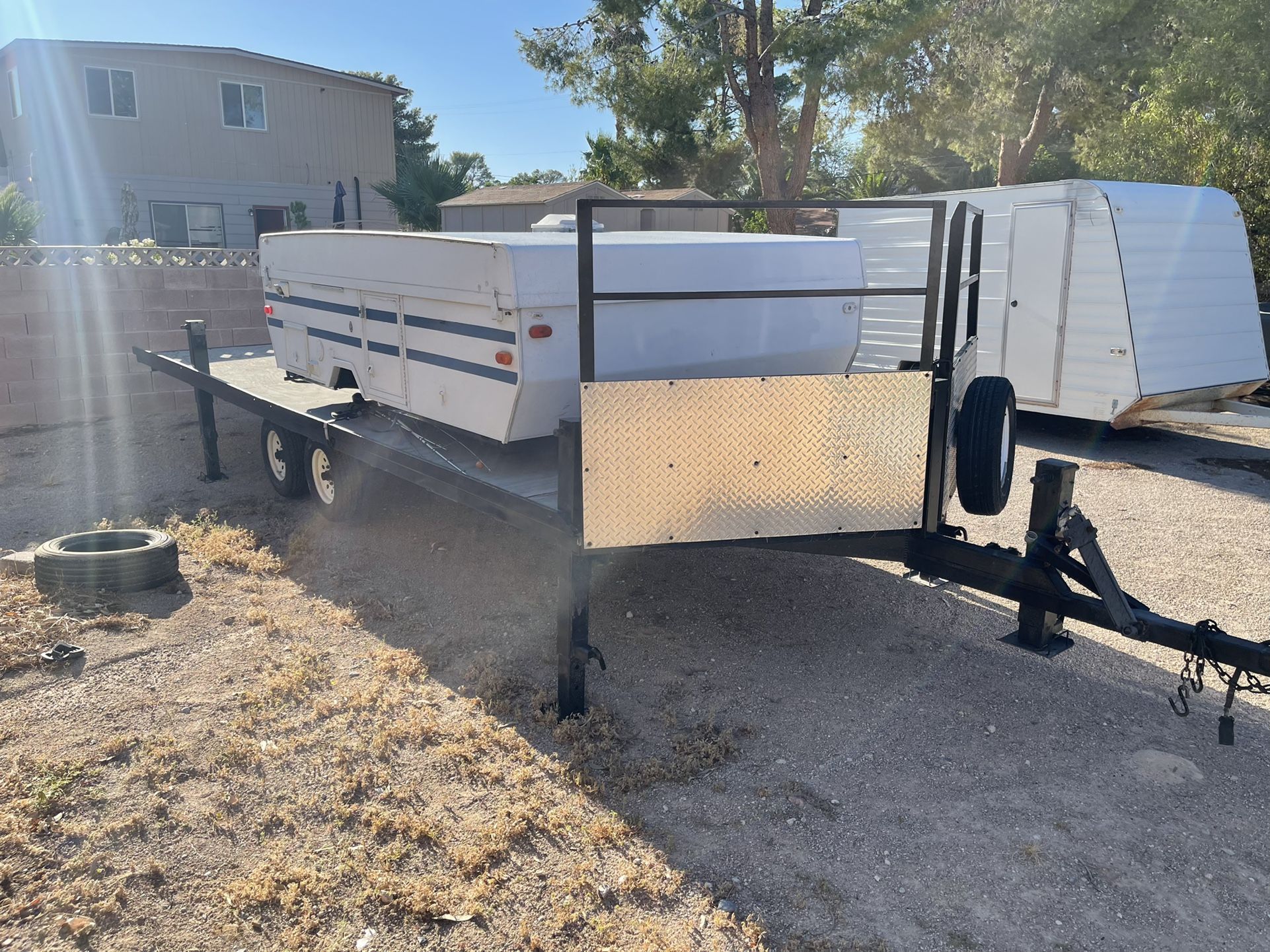 Pop-up camper with toy hauler custom made. Camper swivels and makes for patio. Title for both trailers. Locks in place while driving Five 10,000 pound jacks for EZ leveling to lift the entire trailer. we love this trailer but we upgraded this last year ready for new family new fun. Need some TLC nothing major