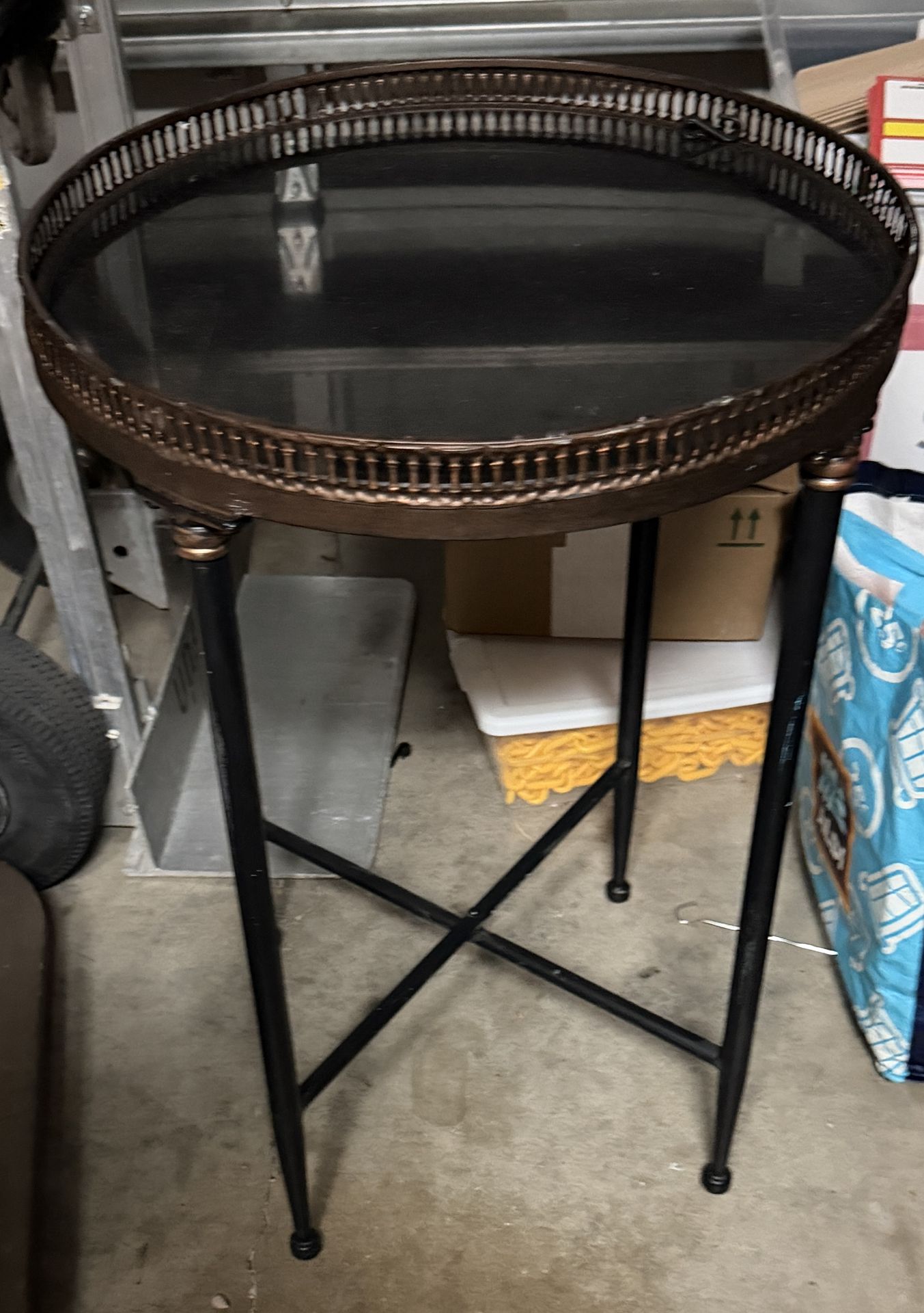 Unique Vintage Accent Tables. They are made of heavy metal and have a glass top. Legs are foldable and tuck away easily and the tops are actually trays as well. The detail on the tray tops is nice. Very sturdy and unique. $15 each or both for $25 Must pick up in Port St Lucie Serious Inquires Only No Scammers!!!