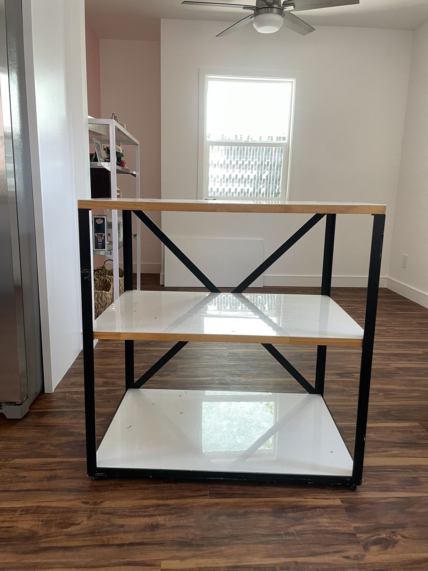 Gently used commercial sized console table. It was used for clothes normal wear and tare. Dimensions: 37” L x 36” W x 24” D