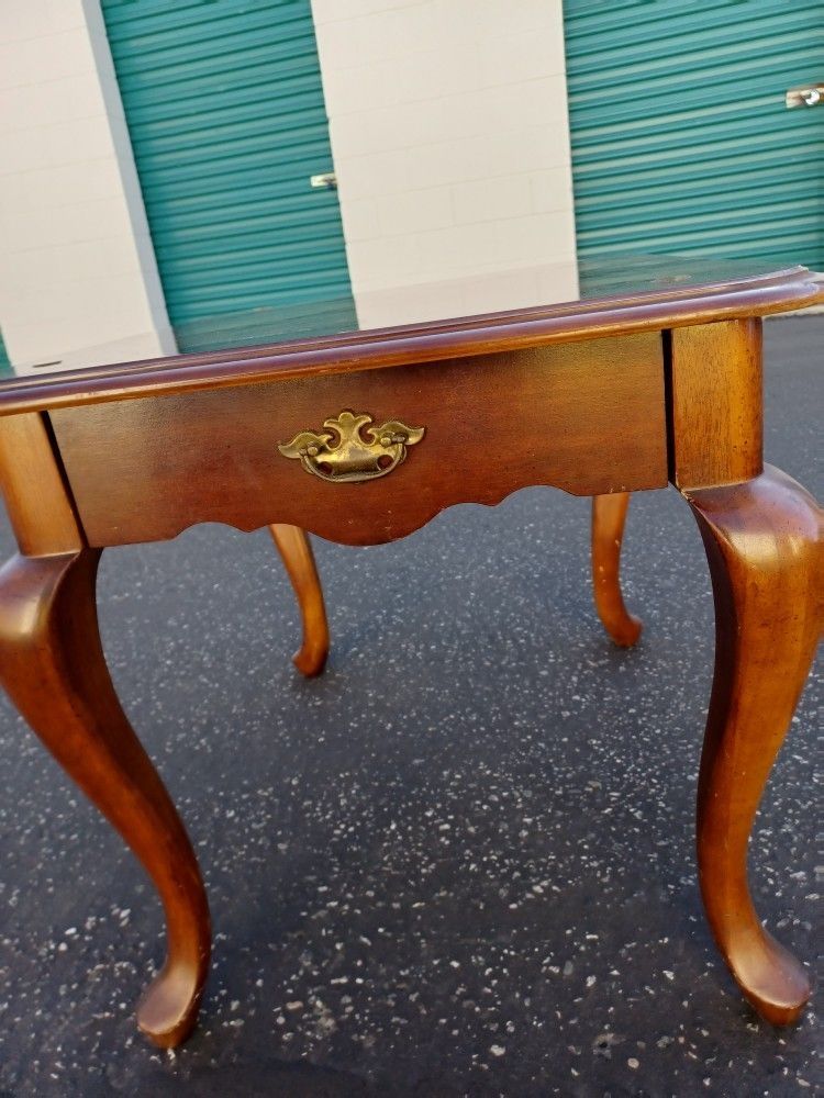 These were my mothers bought in the 60's they all have plate glass tops. Cherry Wood high quality! Make me an offer!