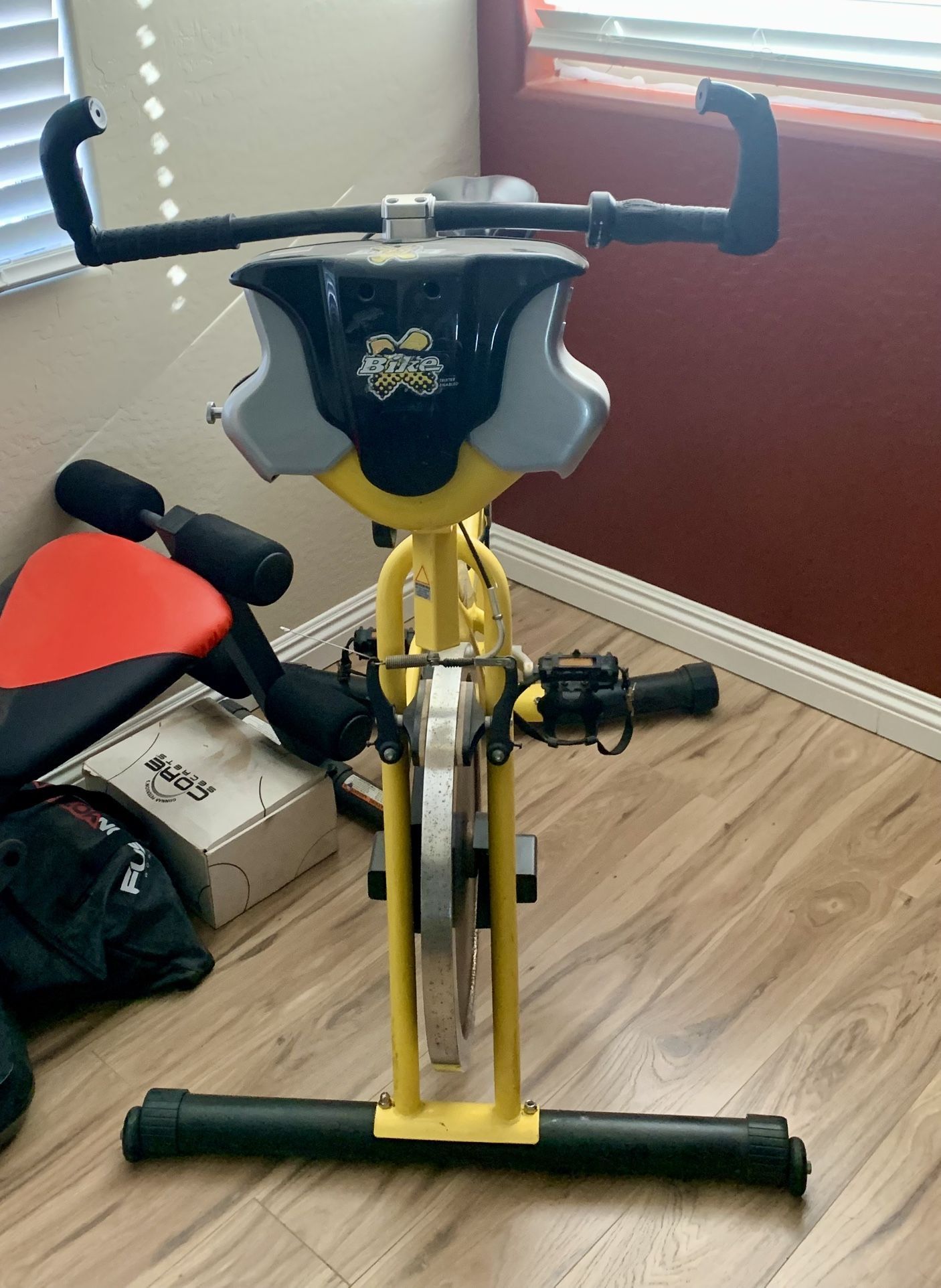 Hi this is not your standard home exercise bike. This is a very heavy duty extreme training bike for actual road race or mountain bike training multi-way resistance, left and right handlebar tension adjustment and seat adjustment. Used for training Olympic teams. Put it in front of your TB and you’ve got a Peleton for 1/5 the price. These sell for over $1000 new. This one is in very good shape, slight wear and tear but everything works. This is a screaming deal $250 cash no apps. Must sell this week! Thank you. Cross streets are El Mirage/Vistancia NW Peoria off the 303 look at a map before you respond please. No apps no scammers