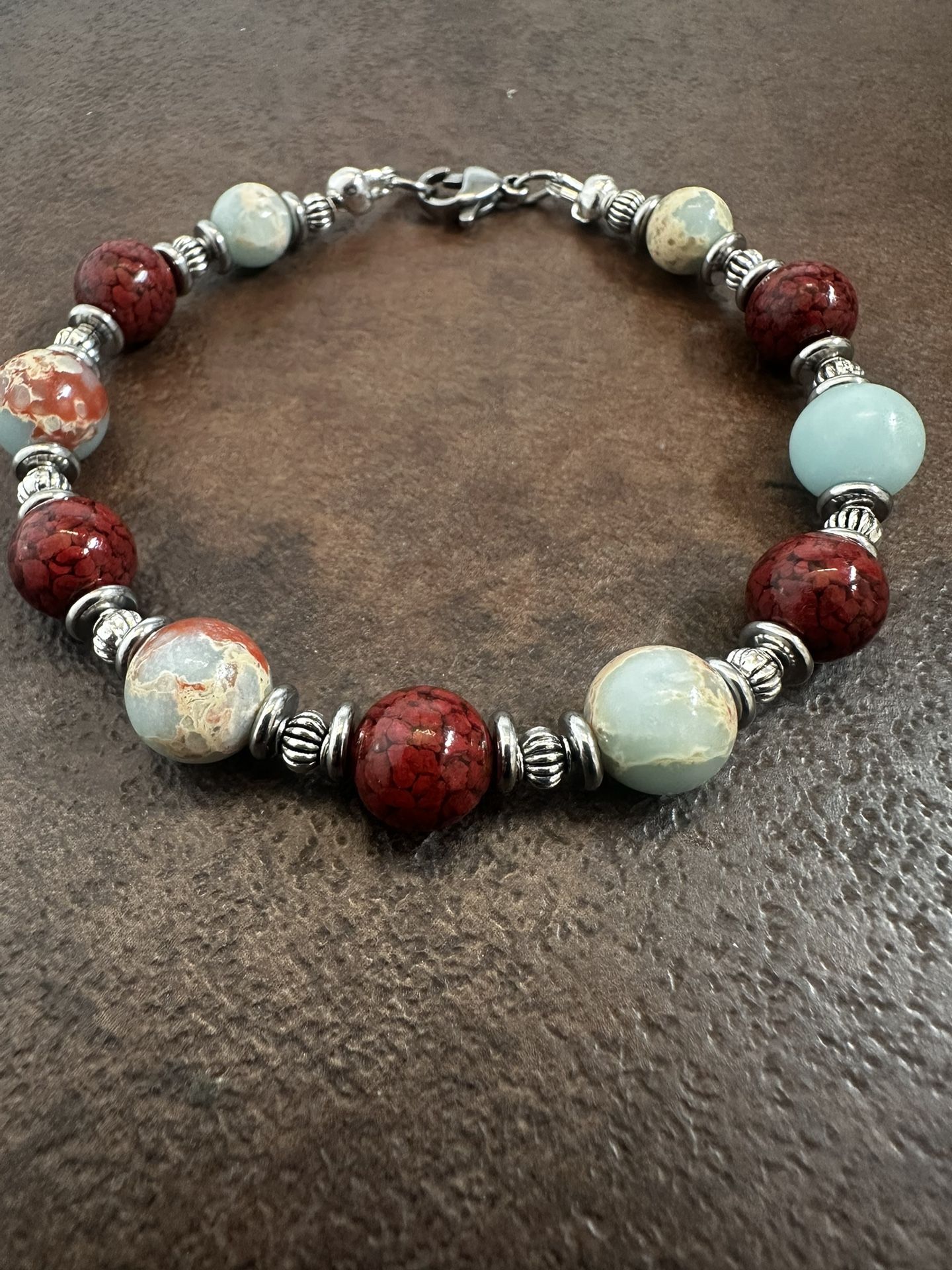 This handmade bracelet is a one-of-a-kind piece of jewelry that is sure to make a memorable impression. The colorful and chic design of the bracelet is both elegant and modern, making it a perfect accessory for any occasion. The bracelet is made of high-quality materials, including semi-precious gemstones, red Howlite and blue Rhyolite which add a touch of luxury to the piece. The bracelet features beautiful Howlite round beads that are 10mm in size, as well as silver hematite and Tibet silver spacers and Stainless Steel Connector. The use of these materials adds a unique and stylish touch to the bracelet, making it stand out from other jewelry pieces. The bracelet is also adorned with artistic wire, which adds a delicate and intricate detail to the design. The bracelet is 8 inches in length and features a lobster clasp, making it easy to wear and remove. The semi-precious gemstones used in the bracelet add a touch of luxury and elegance to the piece, making it a perfect accessory for special occasions. The bracelet is a must-have for anyone who wants to add a touch of sophistication to their wardrobe. Overall, this handmade bracelet is a beautiful and unique piece of jewelry that is sure to make a statement. The combination of high-quality materials, unique design, and beautiful gemstones make it a perfect accessory for any occasion. Whether you're dressing up for a special event or just want to add a touch of elegance to your everyday look, this bracelet is the perfect choice.
