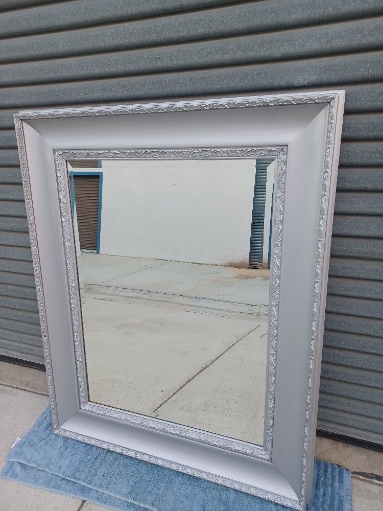 As you can see, this is a very pretty big mirror in silver or light gray color, beveled edges n wood frame.. In excellent condition without scratches or defects.. You can hang it vertically or horizontally.. IT'S 53" x 43"..... IF YOU NEED ANYTHING ELSE FOR UR HOME, LOOK UNDER MY ADS. THANK YOU....
