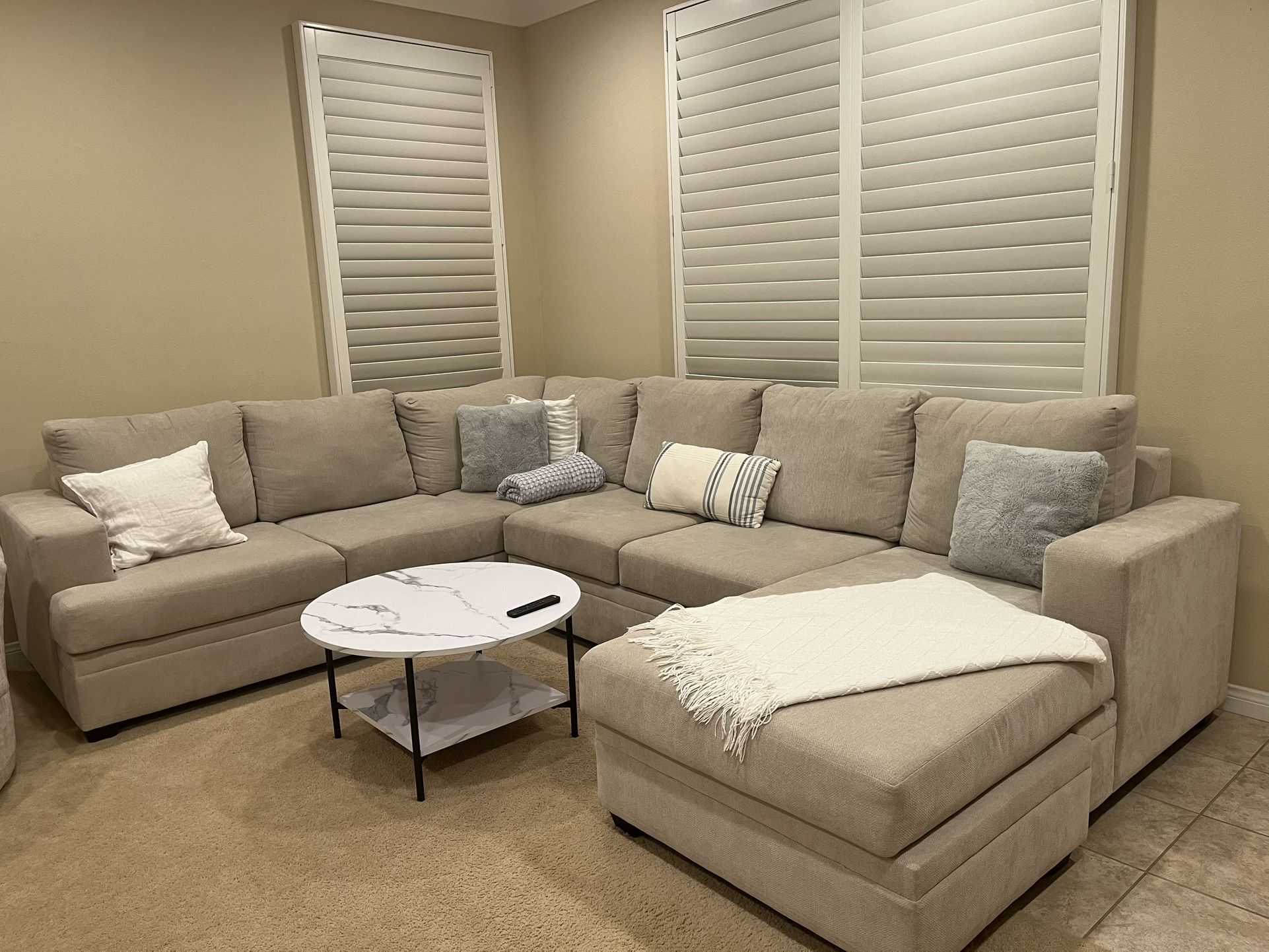 Sofa purchased from Living Spaces 2 years ago . Selling because too large for new apartment. Kid free, pet free and stain free. Spotless like new condition. Comfortability sits 5. Dimensions - 10” (long side), 8’3” (side couch), 5’7” (ottoman side).