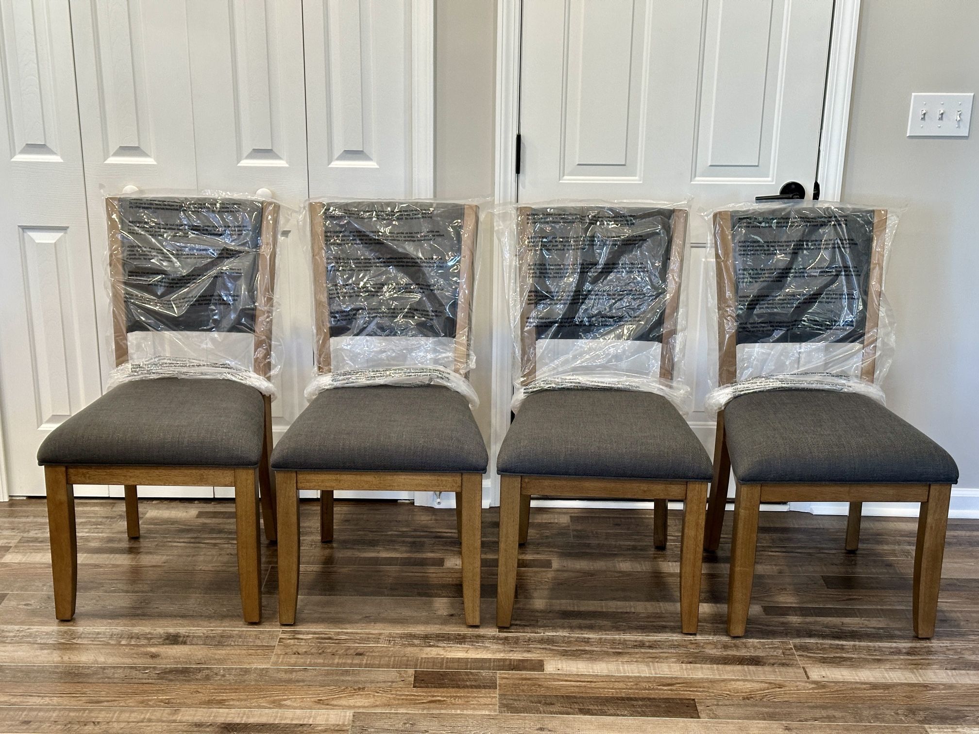 Four comfortable chairs with upholstered seating in a gray fabric blend well with any décor. Sturdy and durable hardwood construction assure many years of use and enjoyment. New. • Chair dimensions: 20 in W x 24 in D x 36.4 in H • Chair weight: 15.8 Ibs • Seat height: 19. 2 in • Seat depth: 17.9 in • Seat width: 20 in