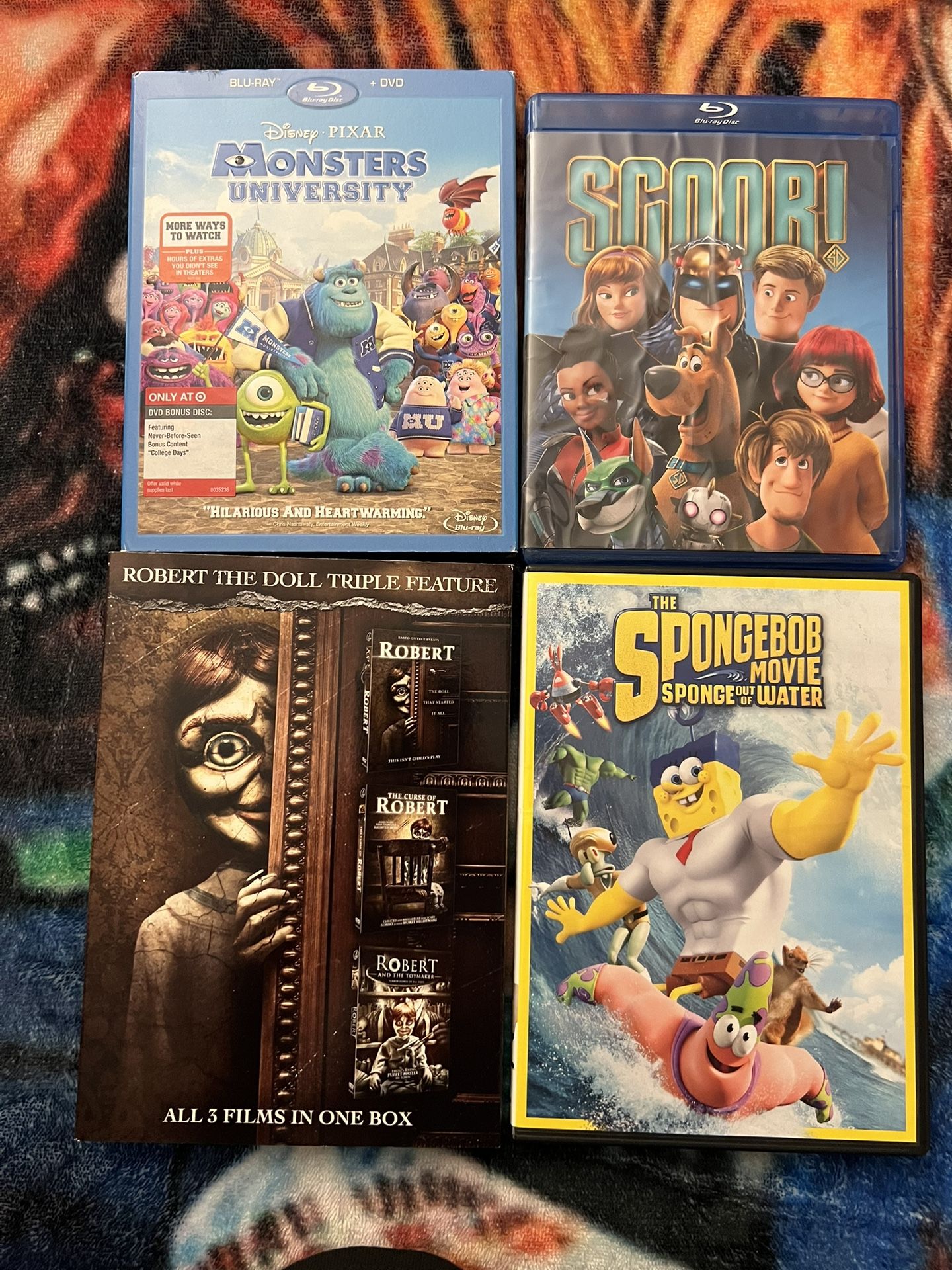 DVD’s & Blu-Ray’s in mint condition. Robert the Doll 3 pack ($2) SpongeBob Movie ($1) Scoob Blu Ray ($2) Monsters University Blu Ray set ($5)