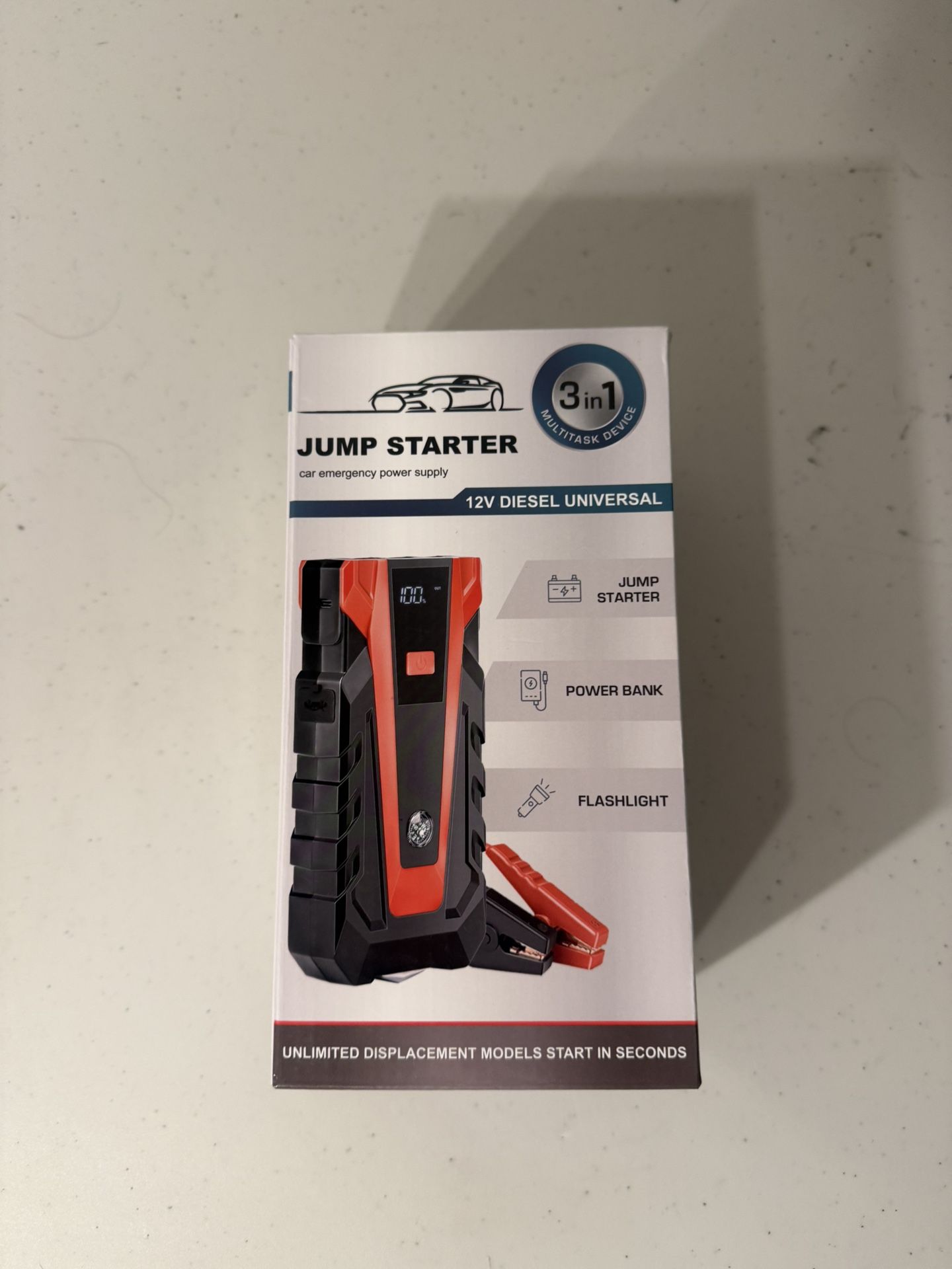 This 3-in-1 portable jump starter is designed for vehicle emergencies, combining a jump starter, power bank, and flashlight in one compact device. Suitable for 12V vehicles, it provides a convenient solution for jump-starting a dead battery, charging mobile devices, and providing light in low-visibility situations. Its rugged design makes it ideal for keeping in your car for roadside emergencies, travel, or everyday preparedness. Features: • 3-in-1 multifunction device: jump starter, power bank, and flashlight • Compatible with 12V vehicles • Portable and compact design • Built-in digital display • USB power bank for charging phones and accessories • Integrated LED flashlight for emergency use Included: • Portable jump starter unit • Jumper cable clamps • Charging cable • User documentation • Original packaging (as shown)