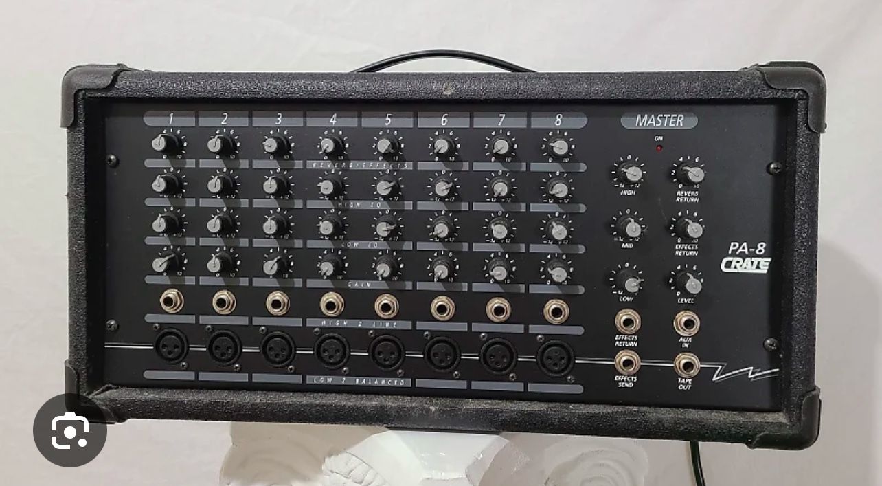 A Crate PA-8 8 channel powered mixer pro audio. This piece features 8 XLR, 1/4’ inputs, and 150 watts at 4 ohms.
