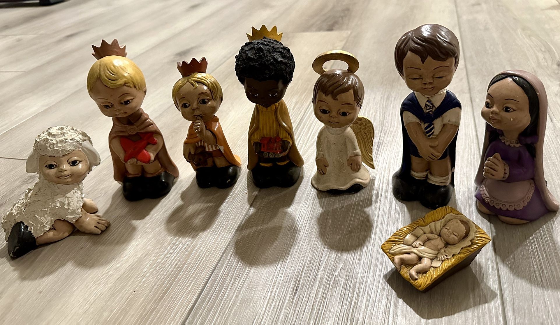 This is a 1975 or later hand painted ceramic Nativity Set, it depicts children dressed up as the Nativity figures. The baby Jesus in the manger is the only one that isn't a child playing dress up. Gare 1975 on each piece except the Baby Jesus. The painting looks great on each. Thanks for looking!