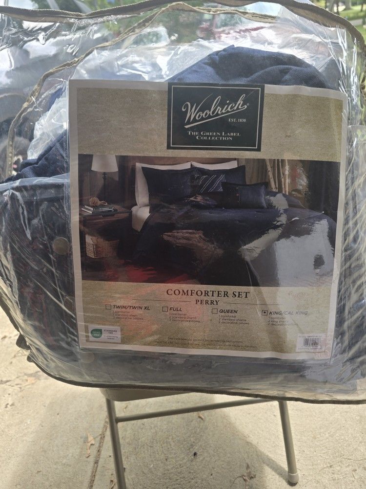 Brand new never been used and still has the packaging on the inside. King/cal King size, comes with 1 Comforter, 2 shams, 2 decorative pillows. Recently moved and we went down to a queen size.