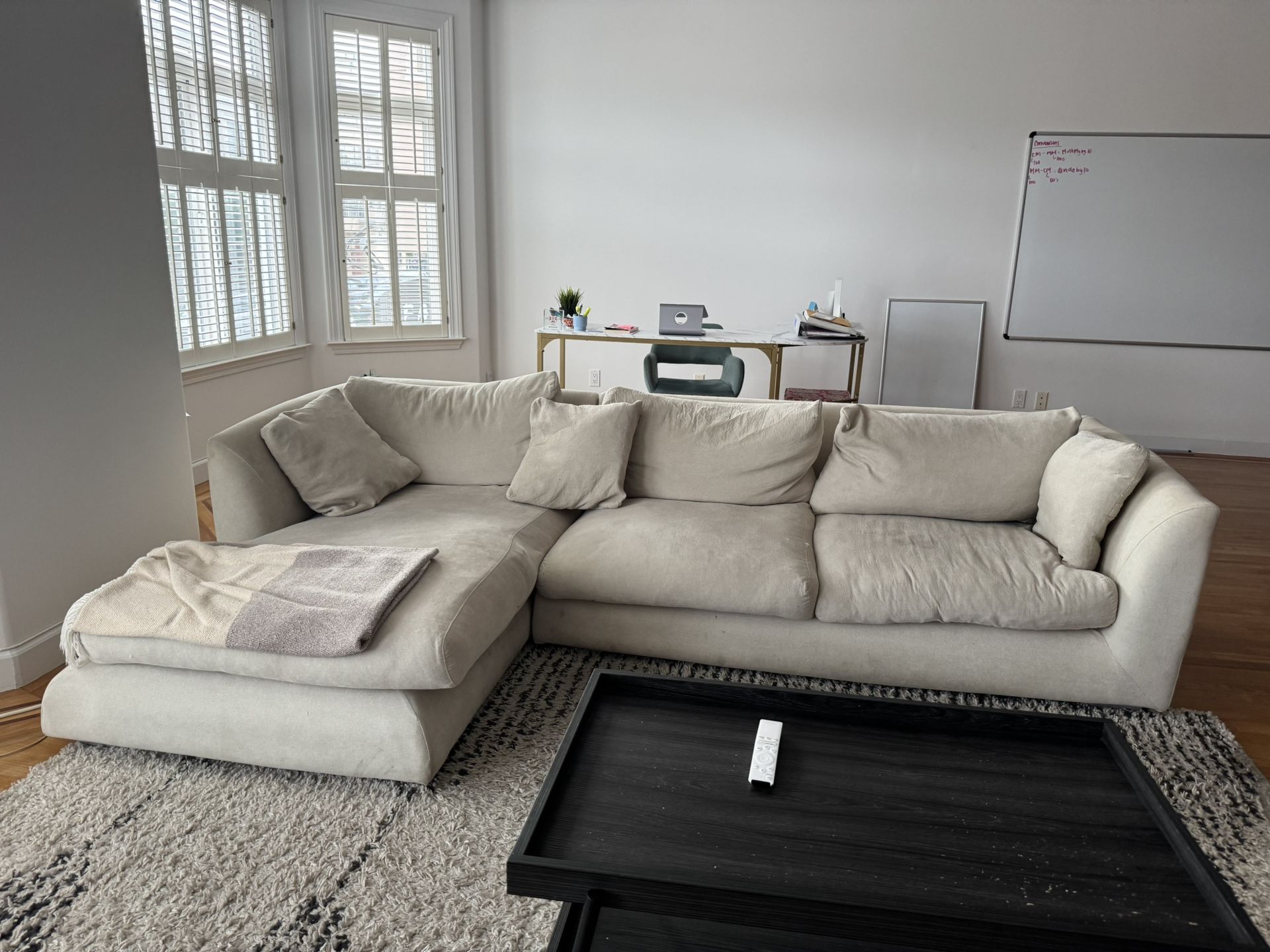 Modern beige L-shaped sectional sofa purchased from Valyou Furniture (originally $2,700). Washable seat and cushion covers. Cozy and soft material. Some wear and tear from over the years.
