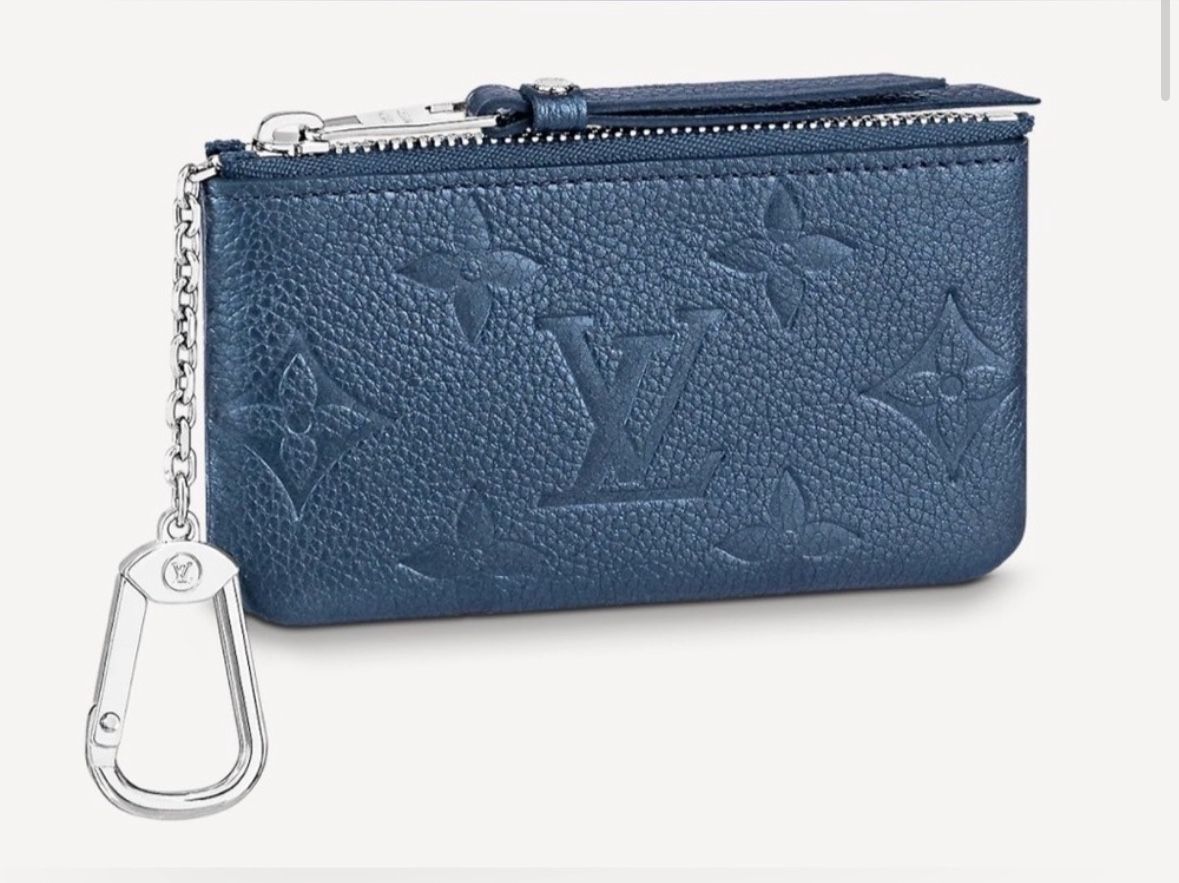Gorgeous Monogram Empreinte grained leather key pouch in a navy-blue hue. The leather has a beautiful pearly finish. New condition. No tag. Dust bag and box included. Detailed Features 4.7 × 2.8 x 0.6 inches (length x Height × Width) Navy Nacre Embossed grained-cowhide leather Grained cowhide-leather trim Cowhide-leather lining Silver-color hardware Lip closure