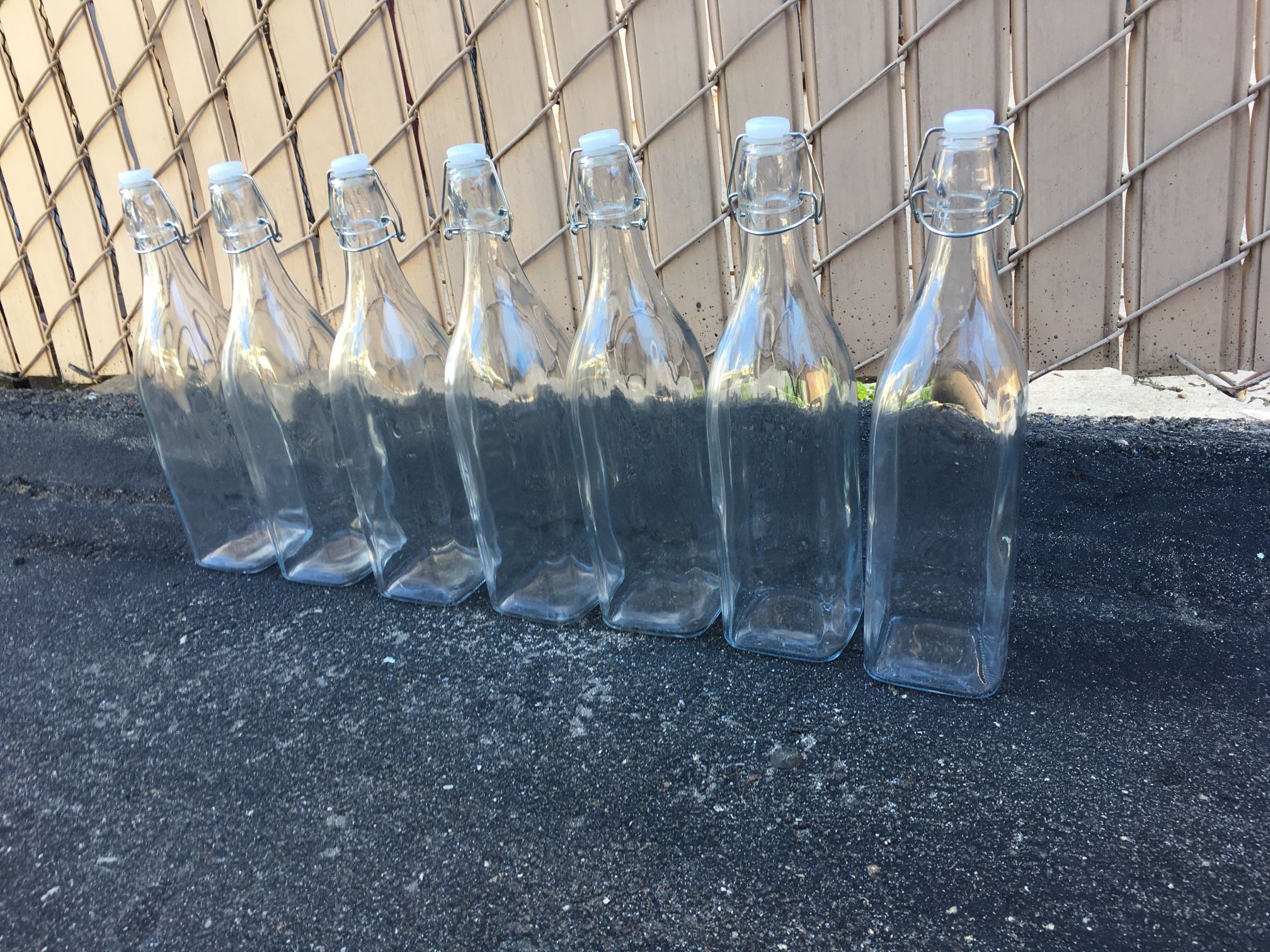 7 Brand new 32oz square bottles with swing lids. Perfect for organizing kitchen liquids, oils, condiments etc.