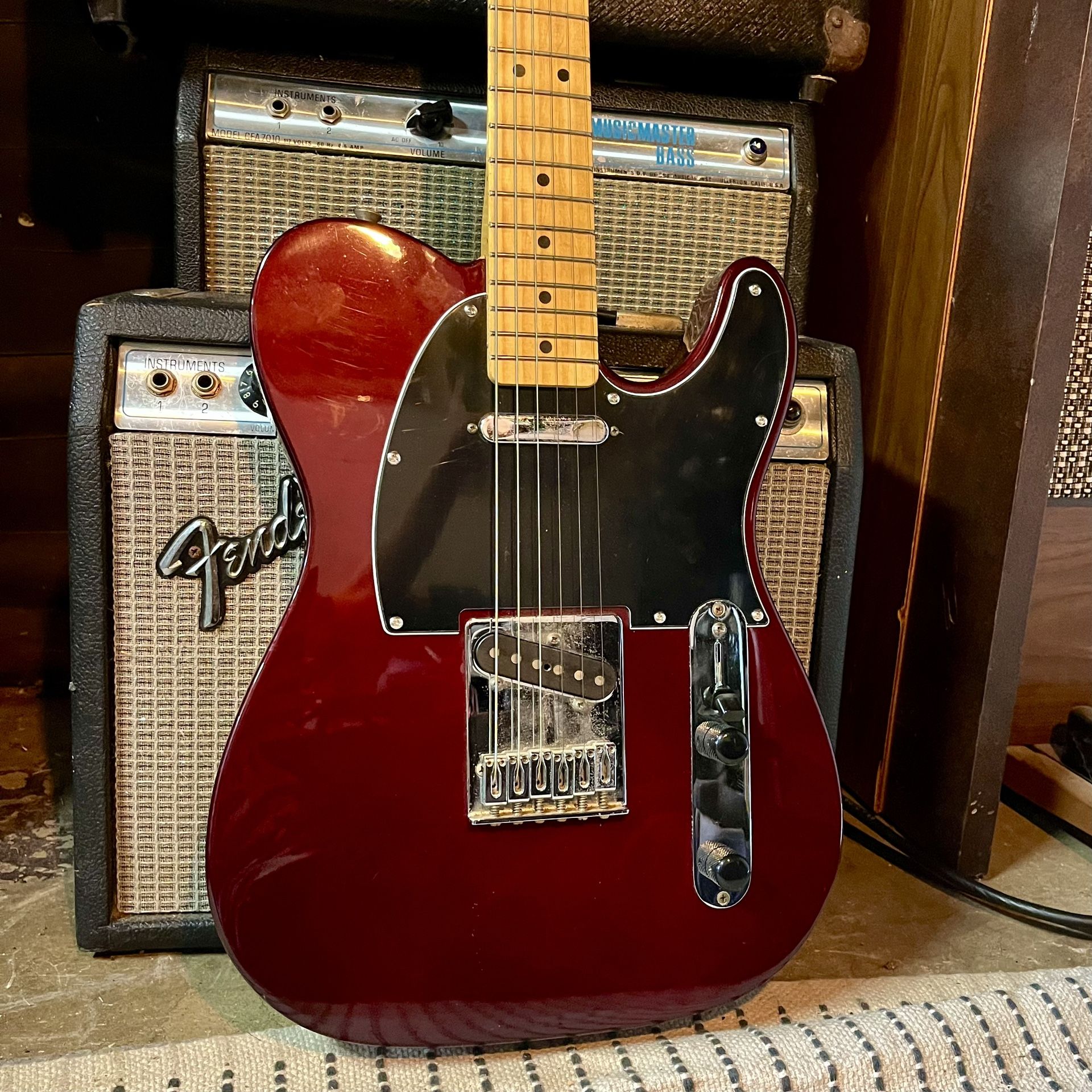 Good set up plays great. Classic Tele sound. 2004 MIM. Has a couple chips in paint as seen second pic. “The Fender Standard Telecaster (MN MDW) is a Mexican-made solidbody electric guitar featuring an Alder body with a Midnight Wine finish, a maple neck (MN) with a modern "C" shape, 21 medium jumbo frets, and hot single-coil ceramic pickups. It is widely regarded as a reliable, versatile, and high-value, gig-ready instrument.”