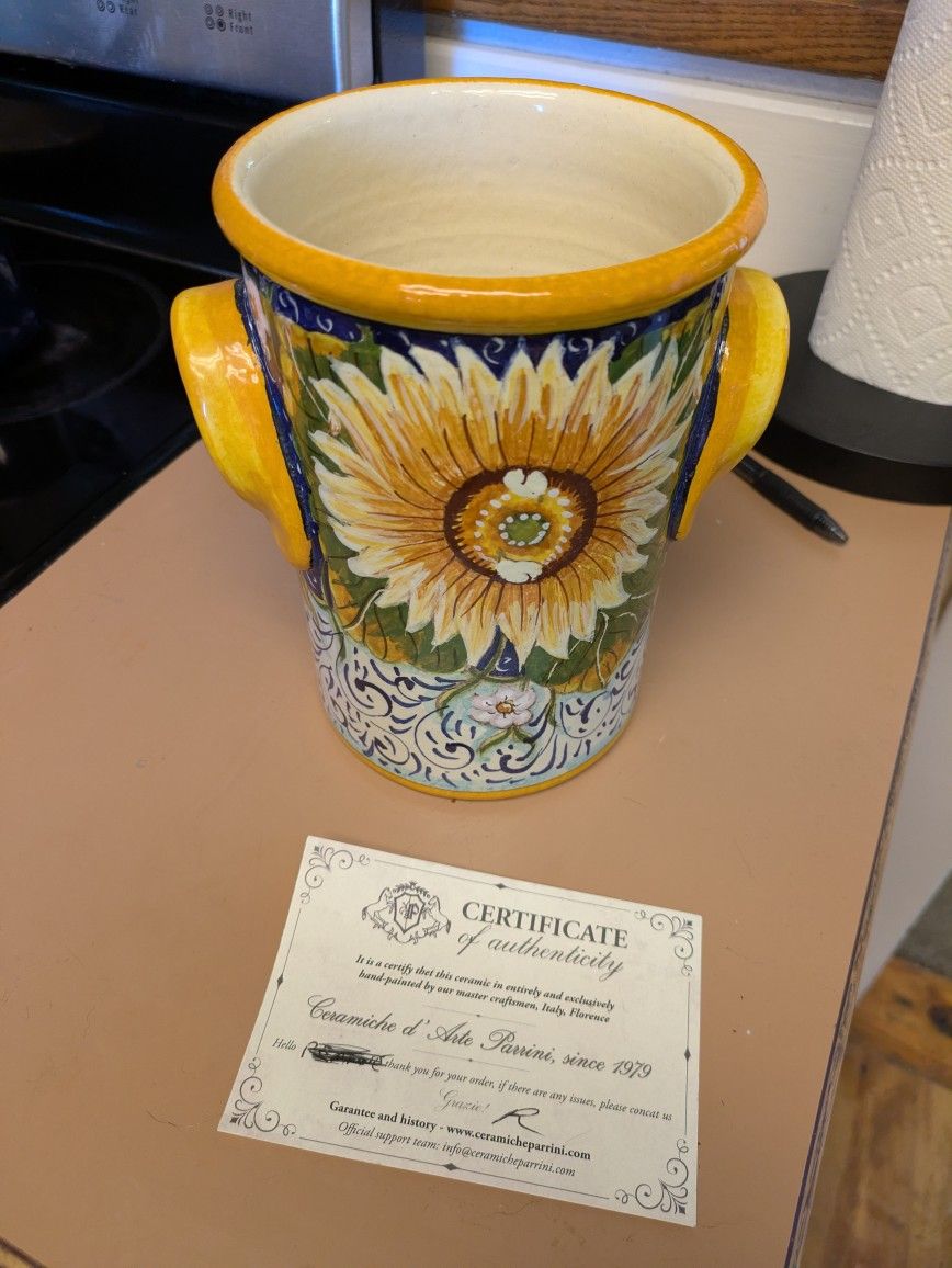 Sunflower vase/utensil holder in excellent condition. Hand painted in Italy.