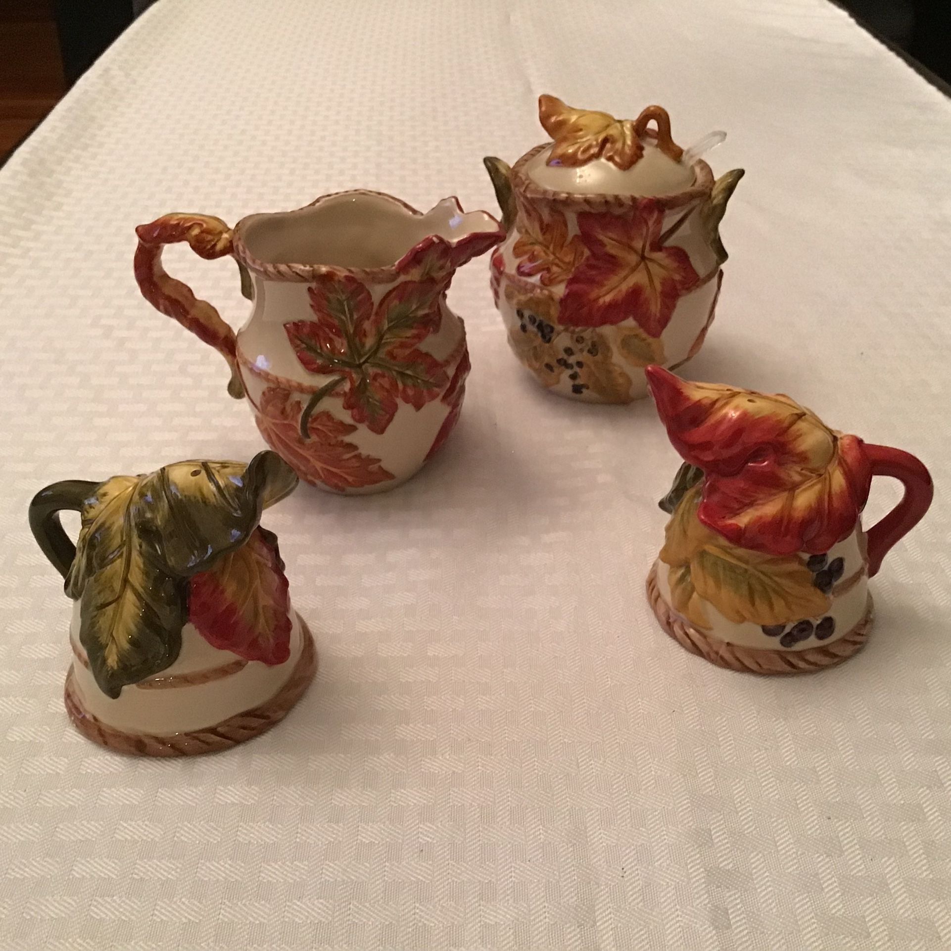 Autumn Leaves Ceramic Table Top Set Set includes: Salt Shaker Pepper Shaker Sugar Pot With Spoon Creamer Pick up in Peabody or Salem Ma. $20