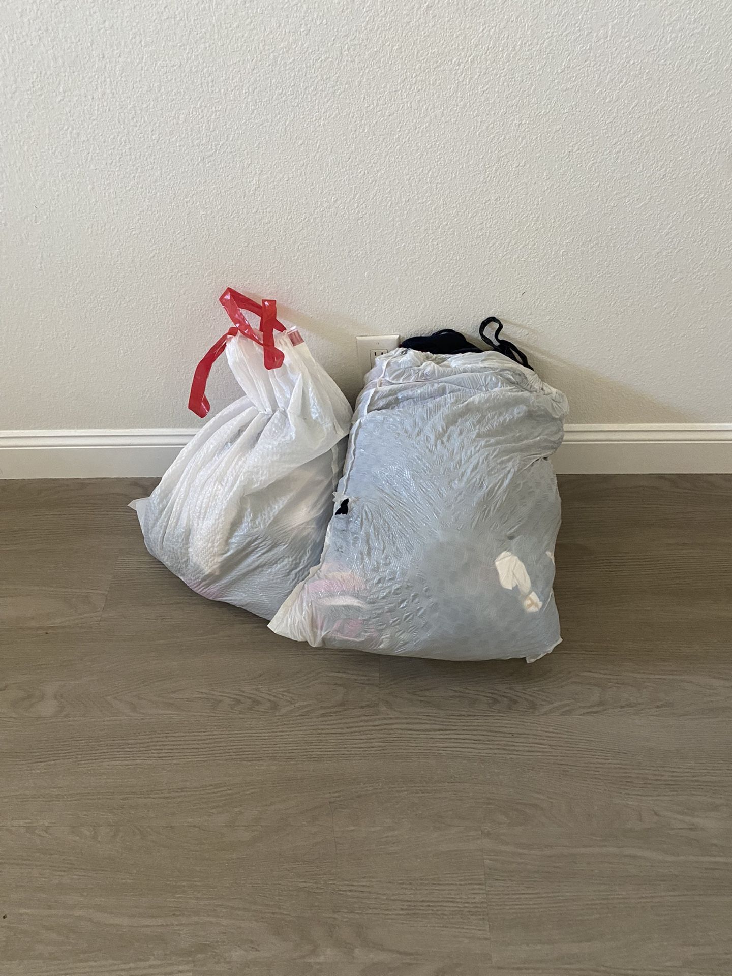 Two bags full of assorted boy and girls clothing and hats. They almost all range from youth medium to adult small