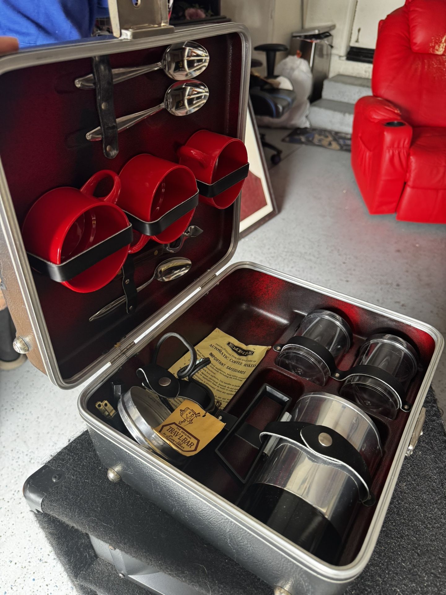 1(contact info removed) vintage Ever-Wear Executair Trav-L-Bar portable coffee maker set. It is a portable coffee bar set housed in a hard-shell black case with a red interior.