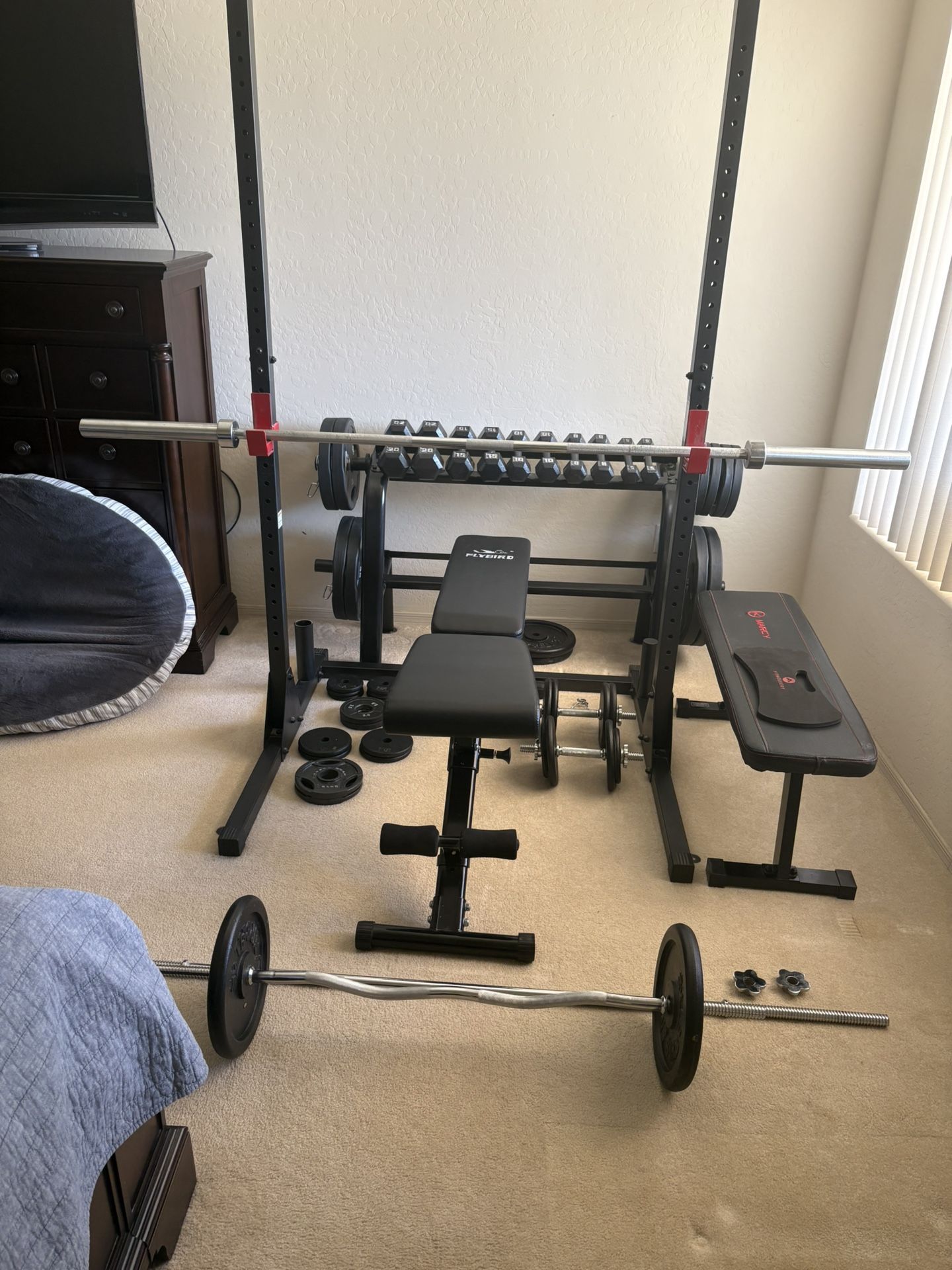 Bench 1: “Marcy” flat bench ($40) Bench 2: “Flybird” adjustable weight bench ($75) Weight Set 1: 1” barbell, curl bar, and dumbbells (x2). Weights include 25lb x4, 10lb x6, 5lb x6, 2.5lb x6 ($75) Dumbbell set: 5lb x2, 8lb x2, 10lb x2, 15lb x2, 20lb x2. ($75) Weight Storage Rack: 2 racks for dumbbell storage, 4 posts for 2” plate storage ($75) Adjustable Squat/bench Rack w/ Pull Up Bar: supports heights for bench, incline bench, squats, etc. ($75)