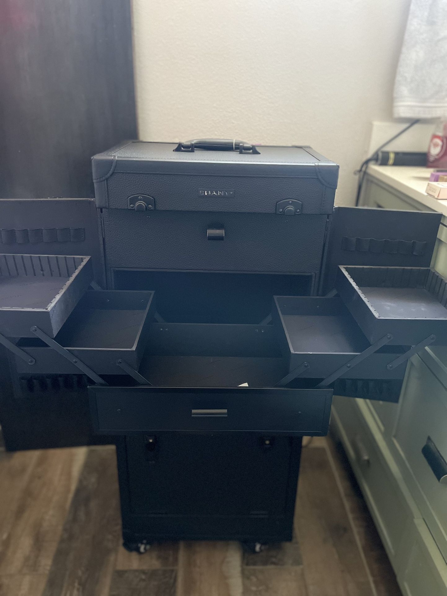 SHANY Rebel Series Rolling Makeup Train Case – Black (Professional Artist Storage SHANY Rebel Series Beta rolling makeup train case in classic black. This is a professional-grade cosmetic and beauty storage case designed for makeup artists, hairstylists, and serious collectors. The case features a durable, leather-textured exterior with reinforced corners, secure locking latches, and a telescoping handle with smooth-rolling wheels for easy transport. Inside, it offers a large illuminated mirror, multiple expandable accordion trays for organized product storage, brush holders built into the side panels, and deep lower compartments ideal for larger tools, palettes, hair products, or accessories. The layout allows excellent visibility and access while working, making it suitable for on-site appointments, studio use, or organized home storage. The interior and exterior are clean and well maintained, showing minimal signs of use. Details: • Brand: SHANY • Model: Rebel Series Beta (SH-REBEL-BETA-BK) • Color: Black • Rolling case with wheels and top handle • Lighted mirror • Expandable trays and deep storage compartments • Lockable closures • Original MSRP: $599.98 This is a solid, professional case that retails at a premium and is built to last. Included are the keys still in packaging and all cords still in there box and a converter for traveling.