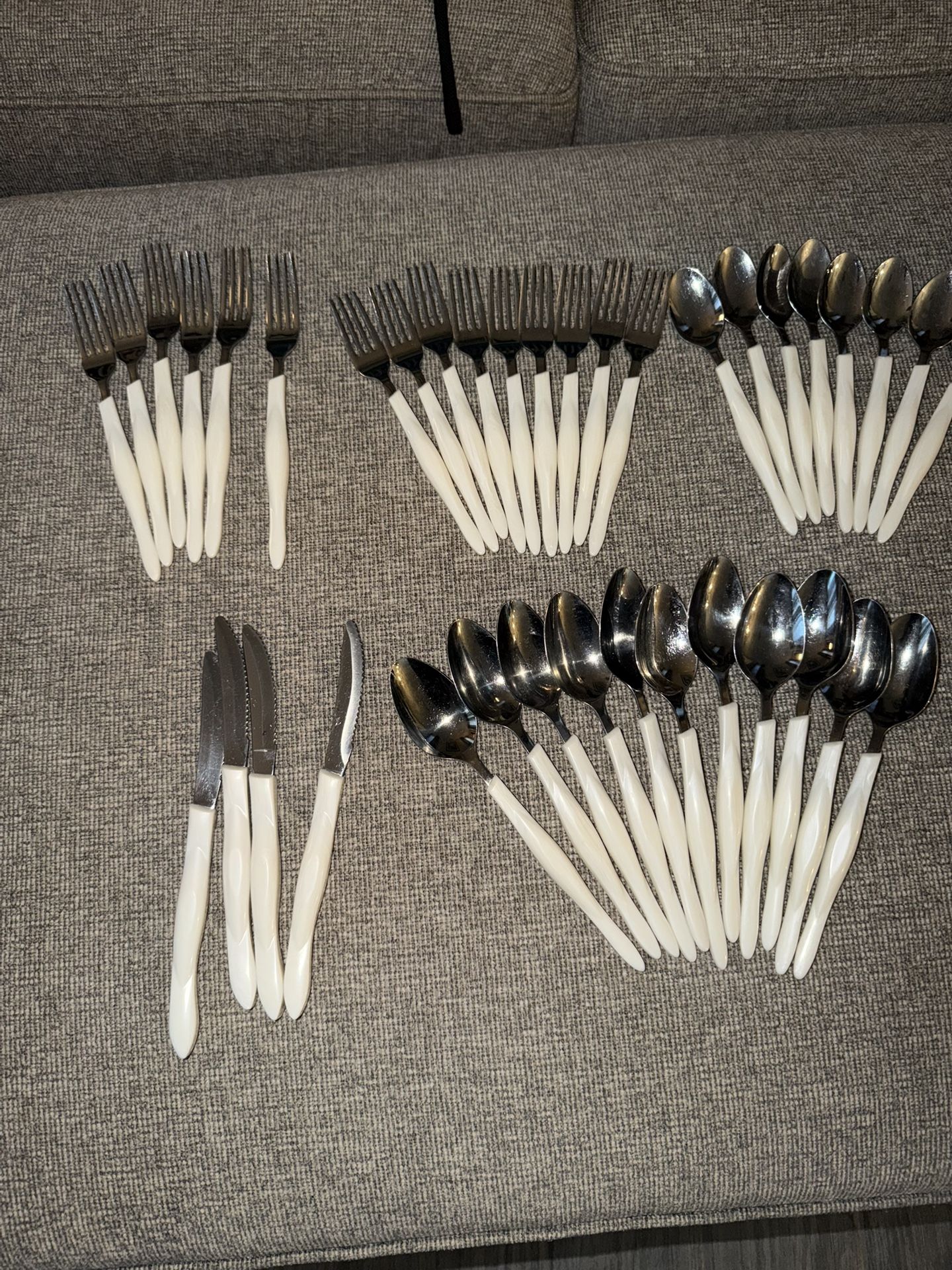 Cutco flatware! #1759 CUE3 Rare to find! Pearl white handles 38 piece set Stainless steel 4 x steak knives 6 x large dinner forks #1550 9 x salad dessert forks 8 x teaspoons 11 x large dinner soup spoons A four piece setting is $199 without the steak knive. Or $75 per one utensil Or buy it all for $950 These are in great shape. Look at the movie. I think I am the only one that has these here on marketplace. These are expensive even on auction sites. If you know what this is then you know this is a great deal. Cash only Pickup only no shipping In Waddell