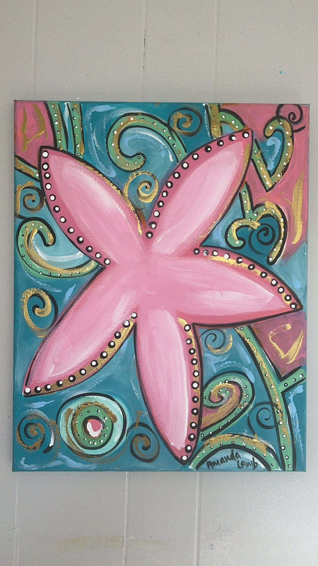 Fun starfish painting for a little girls room or with any coastal decor. Painted on a 16”x20” canvas.