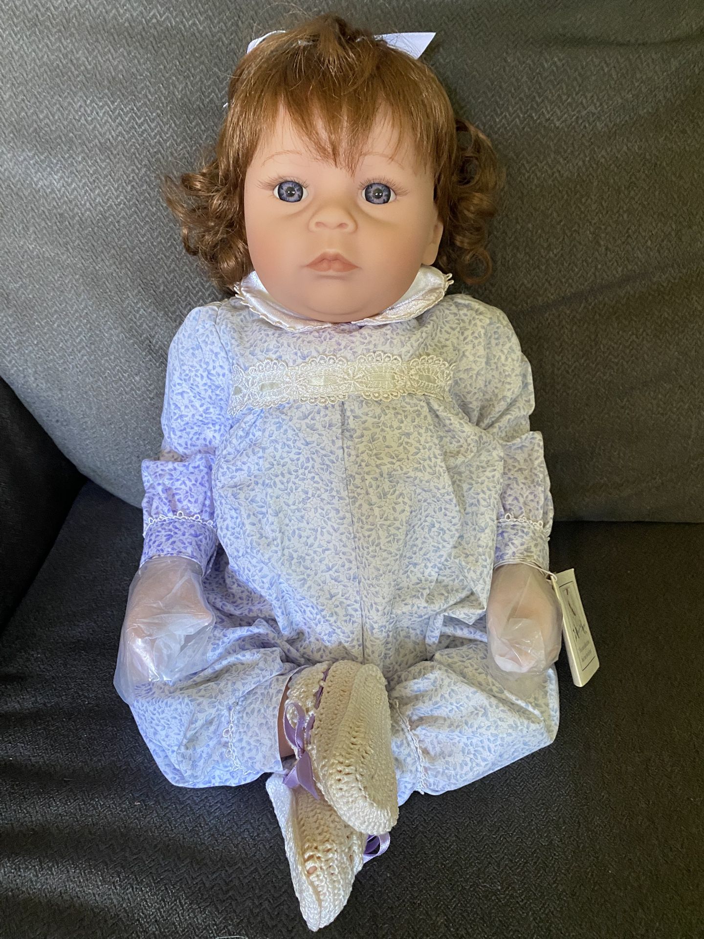 Gentle Part of the "From the Heart" series emphasizes emotional, lifelike baby expressions. Eva Helland, a key artist for Lee Middleton in the late 1990's-early 2000s sculpted under the LM banner. This doll has reddish hair with curls making her more distinctive and collectible, according to "X" rare/hard to find than the blonde or brown haired babies. She comes in mint condition, original everything, COA, baby bible, original box and body tag. Collectibles, therapy dolls, lifelike, hobbies