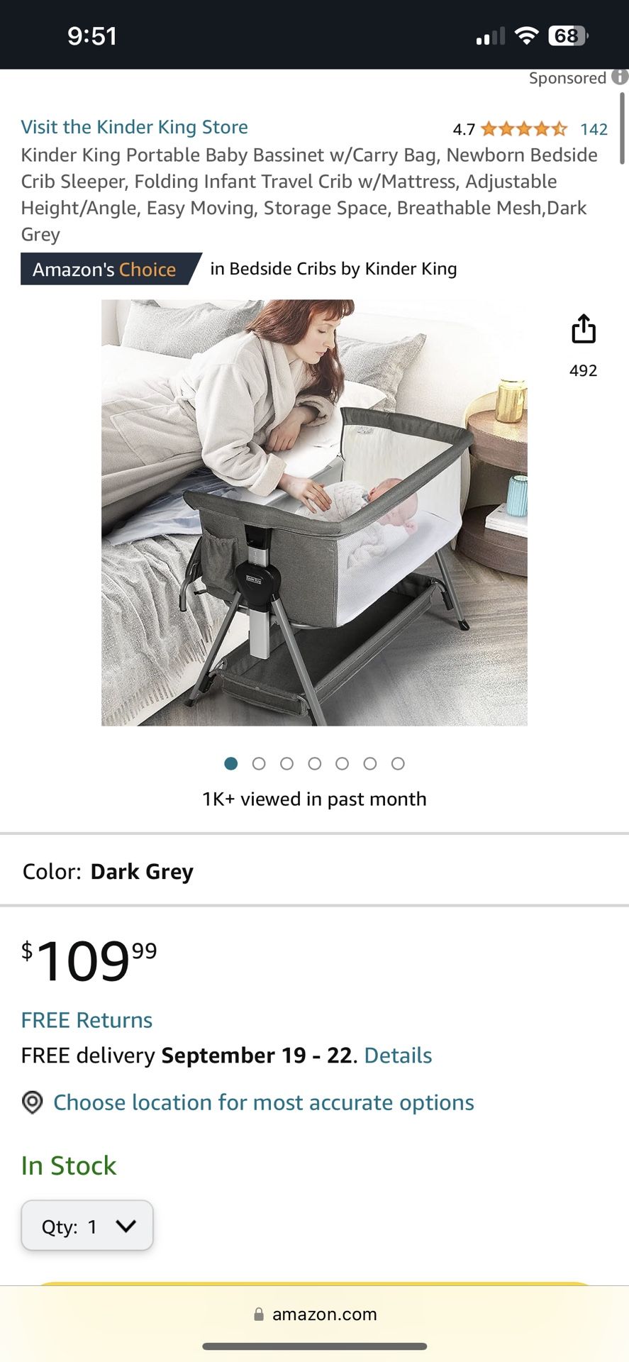 Kinder King Portable Baby Bassinet w/Carry Bag, Newborn Bedside Crib Sleeper, Folding Infant Travel Crib w/Mattress, Adjustable Height/Angle, Easy Moving, Storage Space, Breathable Mesh,Dark Grey The more you buy from my page baby items the more I can discount for you.