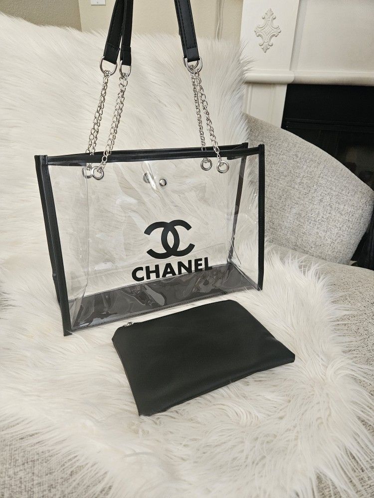 New 2 pieces >Cosmetic Pouch Faux leather material Zipper closure Pls.see pictures for measurements >Transparent Tote Thick PVC plastic material Has faux leather and silver chain handles Snap closure Pls.see pictures for measurements ALL OFFERS ARE WELCOME