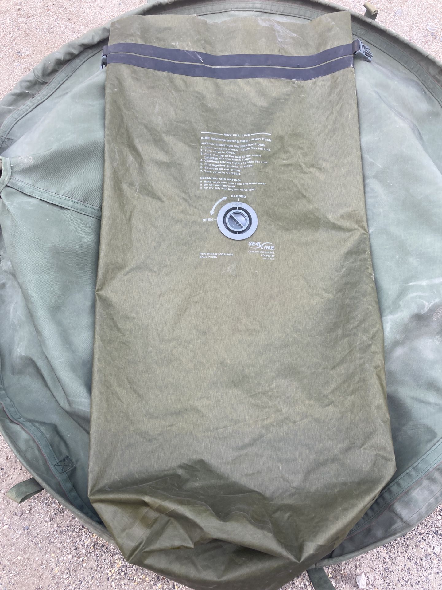 Keep vital gear bone dry with this U.S. Military Waterproof Dry Bag, originally manufactured by legendary outdoor maker SealLine under government contract. Designed for compatibility with the ILBE rucksack system, but a great choice for any mission requiring 100% waterproof performance. Perfect for emergency supplies, rations, extra clothing, electronics or any other sensitive gear. 210-denier nylon with polyurethane coating Roll-down closure with buckle Manual air purge valve for minimizing bulk Key Specifications Material: Rubberized nylon Color: Olive Drab Medium (56L) Dimensions: 31" x 12" diam. (3,417-cu. in.) Large (65L) Dimensions: 33" x 12" diam. (3,967-cu. in.)