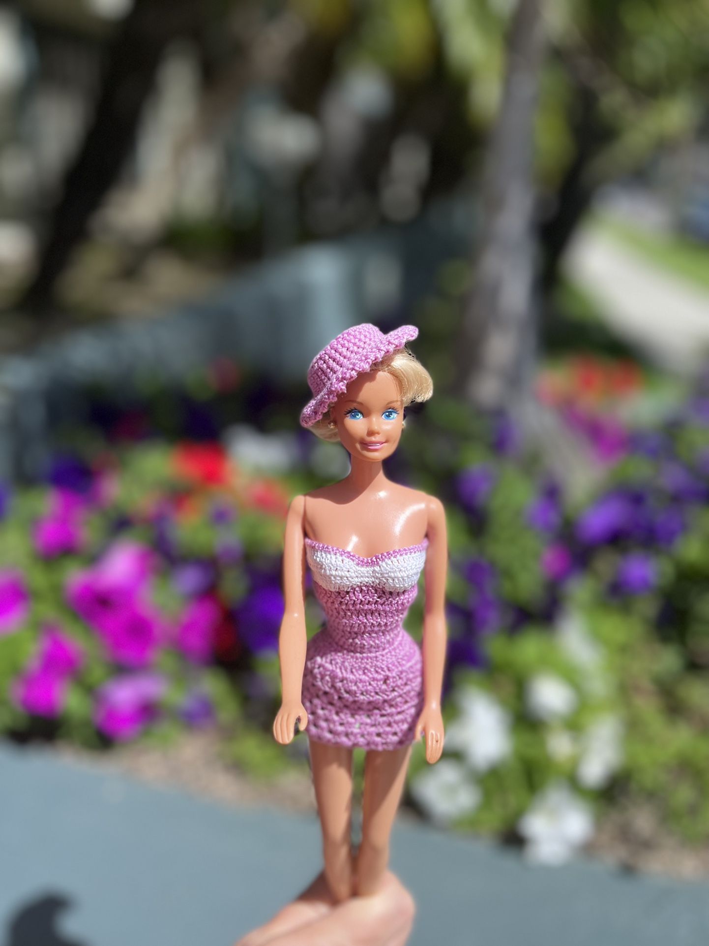 Crochet mini dress with white top for Barbie or 11,5 inch doll. Hat include. Handmade. New. Please look my profile. I have a lot clothes for dolls.