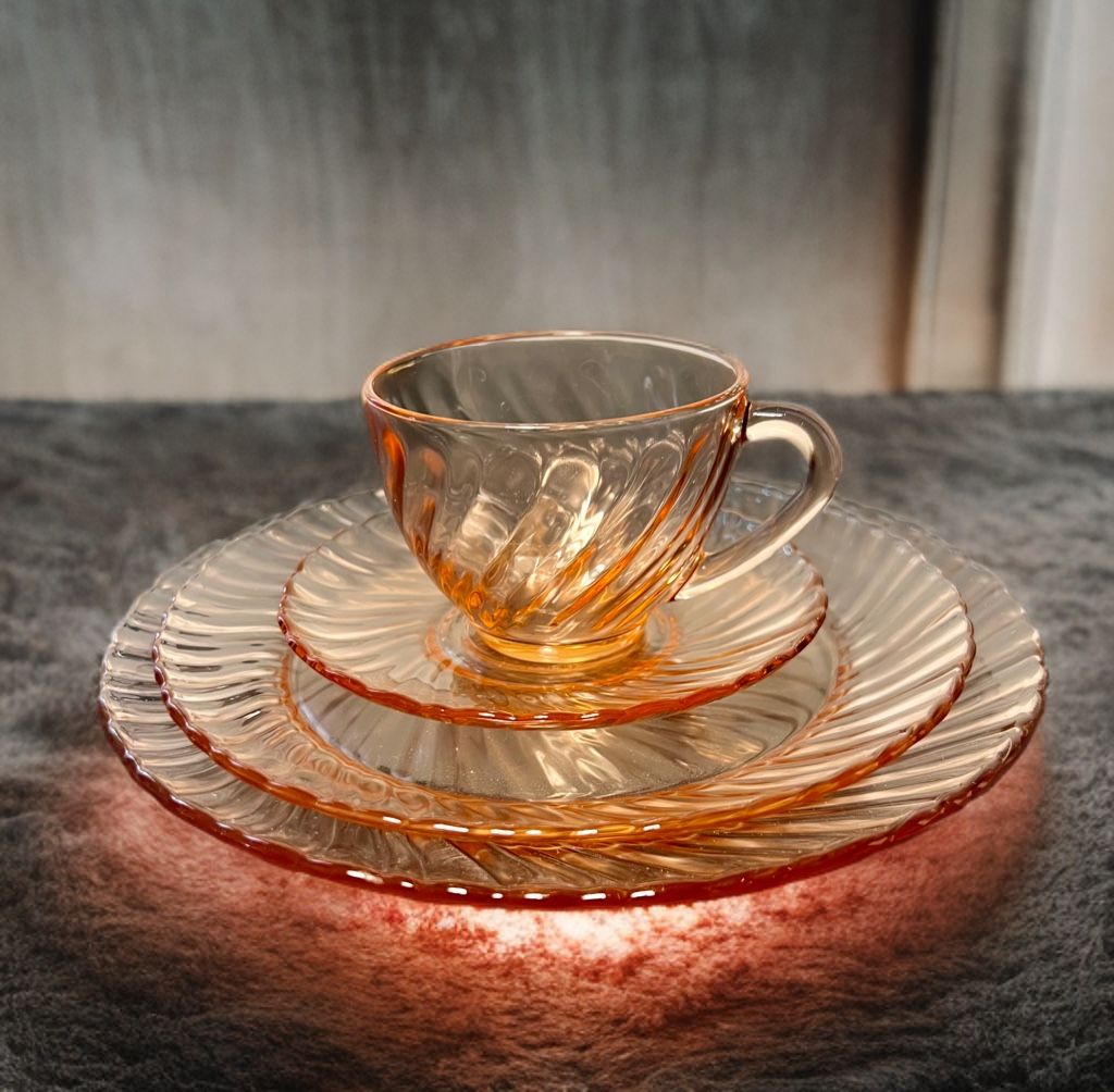 Arcoroc France 1980s Rosaline 16 Pieces Pink Glass Hostess Set Original Box SHIPPING IS AVAILABLE PLEASE NOTE: The first image is an artistic representation; all other photos and the video show the actual items. Pictures are part of the description, please check them & let me know if you require additional ones. 3 sets are available - this listing is for one of them, Great vintage condition consistent with its age – no chips, cracks, repairs or damages. Original box shows signs of wear from age & storage. Defects & imperfections - please check pictures made under the bright light & magnification: few items show small utensil marks only visible under bright lights & magnification. Majority of items are unused. Set includes: - 4 cups 3.5 x 2.75 in - 4 saucers 5.5 in - 4 dinner plates 9 in - 4 salad /dessert plates 7.75 in Weight: 9 lb 1 oz
