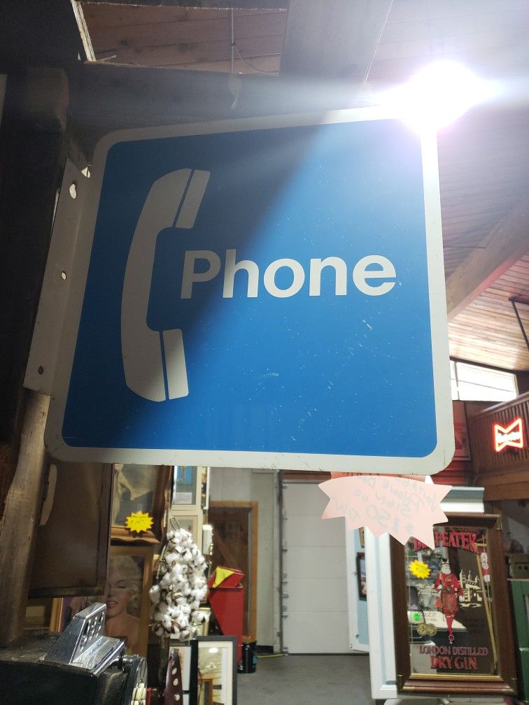 Vintage metal PHONE BOOTH SIGN. Take it home for $150.00. Also if you want buy the cool reproduction telephone for $85.