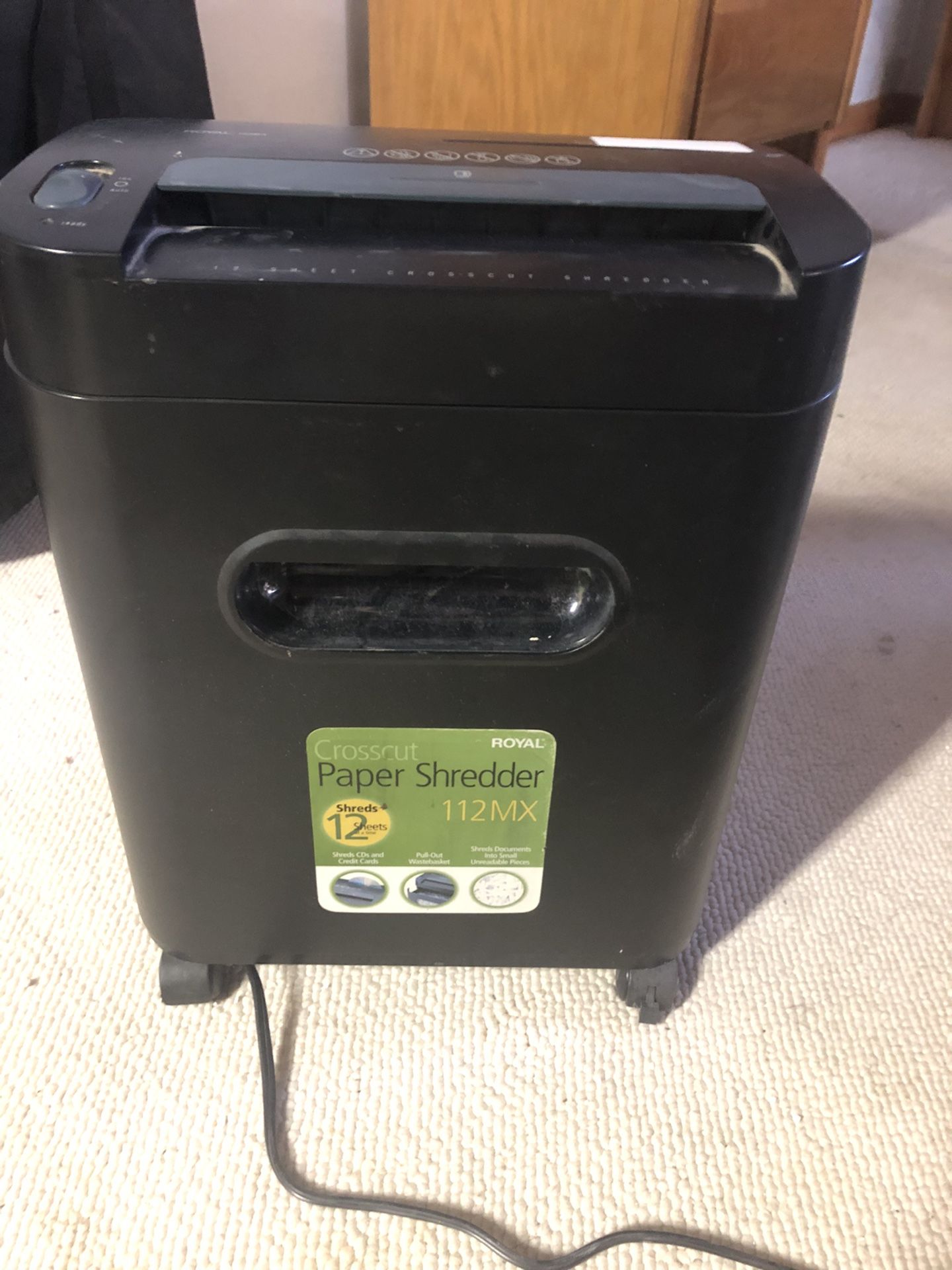 Royal 112MX paper shredder. Shreds 12 pages at once, CD’s, credit cards, etc. Shredder is on lockable wheels and has window to see how full the bin is.