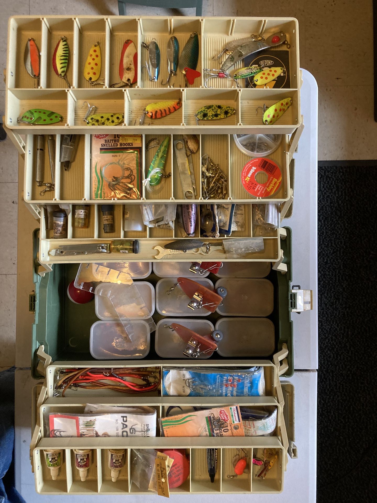 Box full of trout tackle , Les Davis Deep Six Diving Sinker , spoons , flashers, little Cleo Wigl lures , cast master , blue fox and much more …