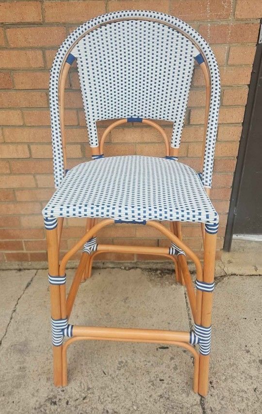 French-style bar stool with a natural rattan frame and two-tone woven seat/back. Lightweight but sturdy with a classic bistro look that works great in kitchens, bars, or breakfast counters. Perfect for boho, coastal, farmhouse, or modern decor.