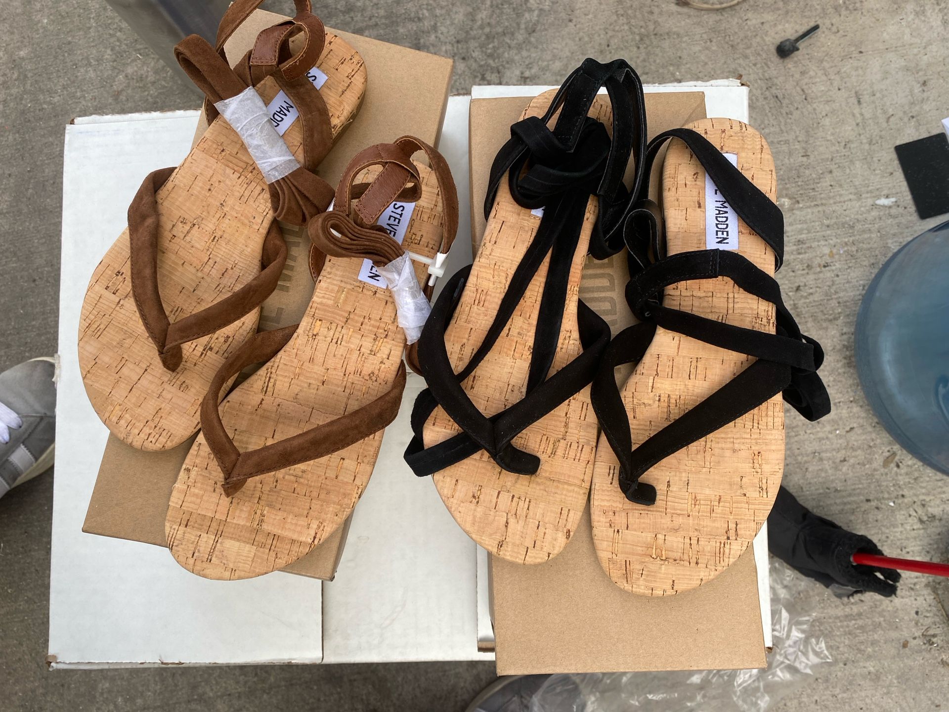 I have 2 New pairs one black one brown Steve Madden Sandals. New-in Box Ankle tie Size: 7.5 Both for 50 or 30 each.