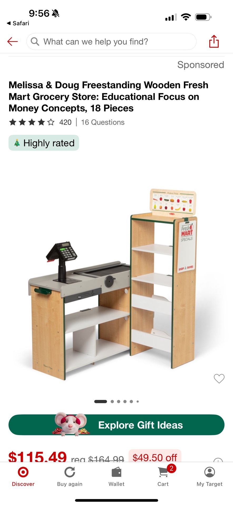 Free-standing sturdy wooden grocery store in excellent condition. 32” x 35.5” x 25” assembled Includes hand-cranked conveyor belt, beeping “scanner,” bagging area, card swipe machine, and cash drawer Shop on one side, ring up groceries on the other Ample shelving on both sides for display and storage; smooth, curved corners and edges 2 AA / LR6 Batteries required (Not included) Food not included. Regular price is $165+