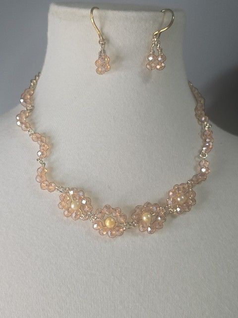 Each flower cluster features faceted champagne-blush crystals carefully wire-wrapped around luminous ivory pearls, creating a subtle sparkle that catches the light beautifully. The gold-tone chain enhances the warm tones of the crystals, making this set perfect for weddings, bridesmaids, prom, anniversaries, or romantic evening events. The matching drop earrings mirror the floral design for a cohesive and polished finish. Lightweight yet eye-catching, this set offers statement beauty without heaviness — ideal for all-day wear.