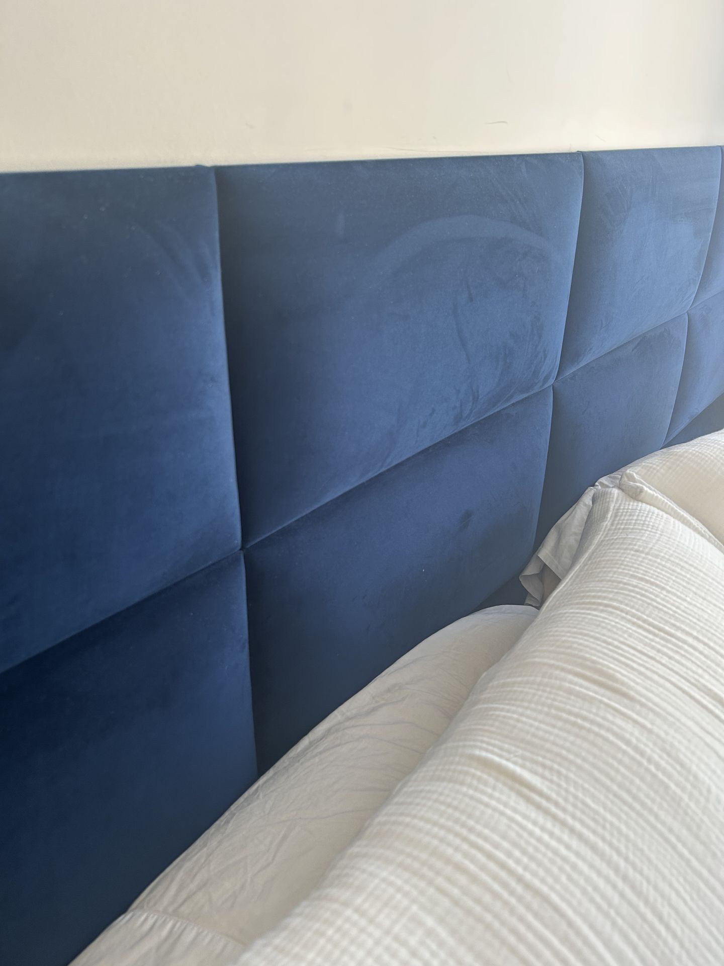 Give your bedroom a hotel feel with these unique, super soft, and hand made padded velvet panels. Or use for an accent wall 14 individual panels Each panel: 23.6” x 11.8” Installed with 3M Velcro stripes. No hardware or wall damage Cleaned w damp clothe or swiffer Perfect condition Non smoker No pets or kids No stains or marks New was over $400