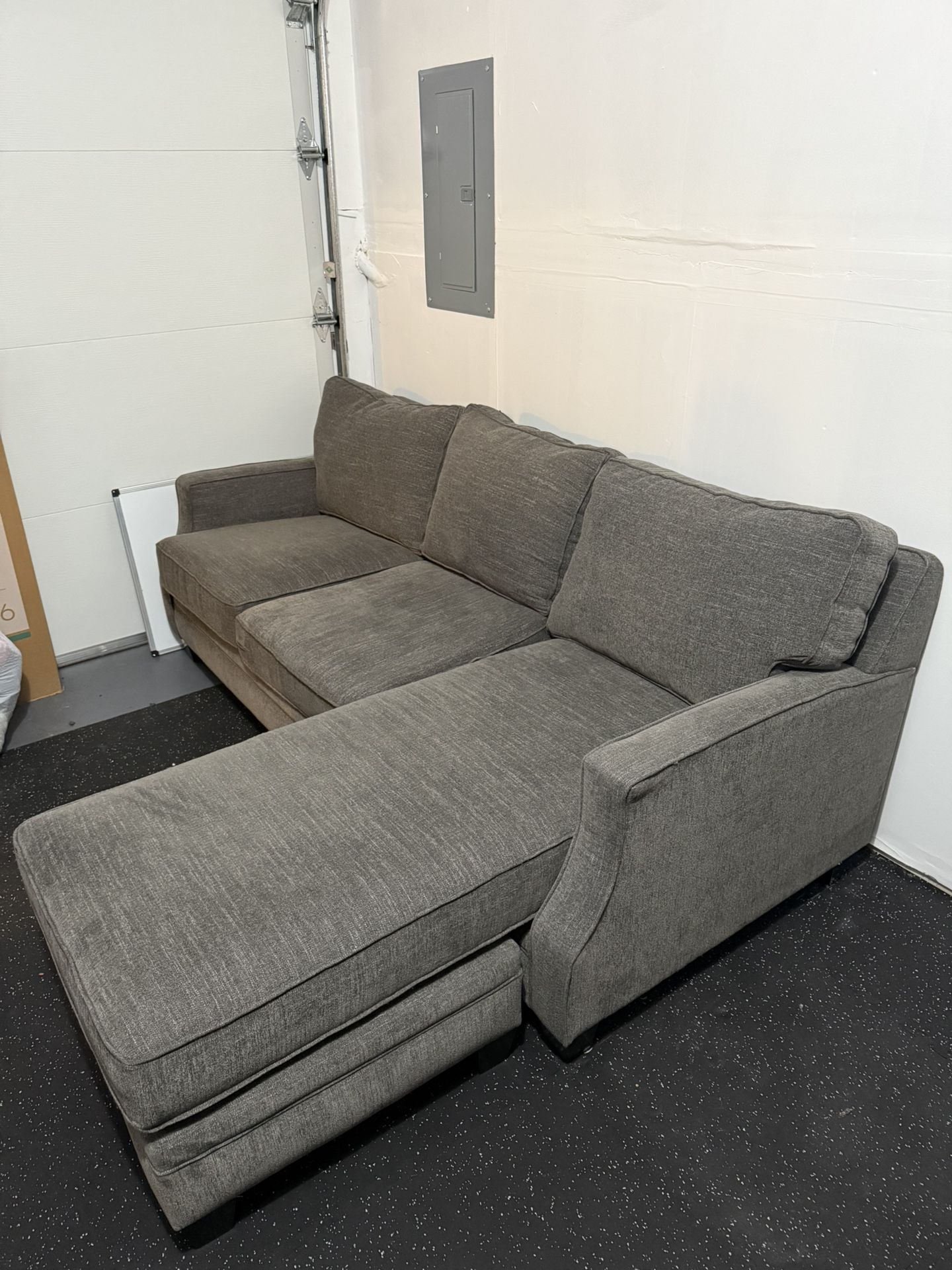 Smoke and pet free dark gray couch. (Removable ottoman under L-shape cushion) Lightly used with moderately firm cushions. Dimensions are 86” L 67” W 36” H No rips or tears.