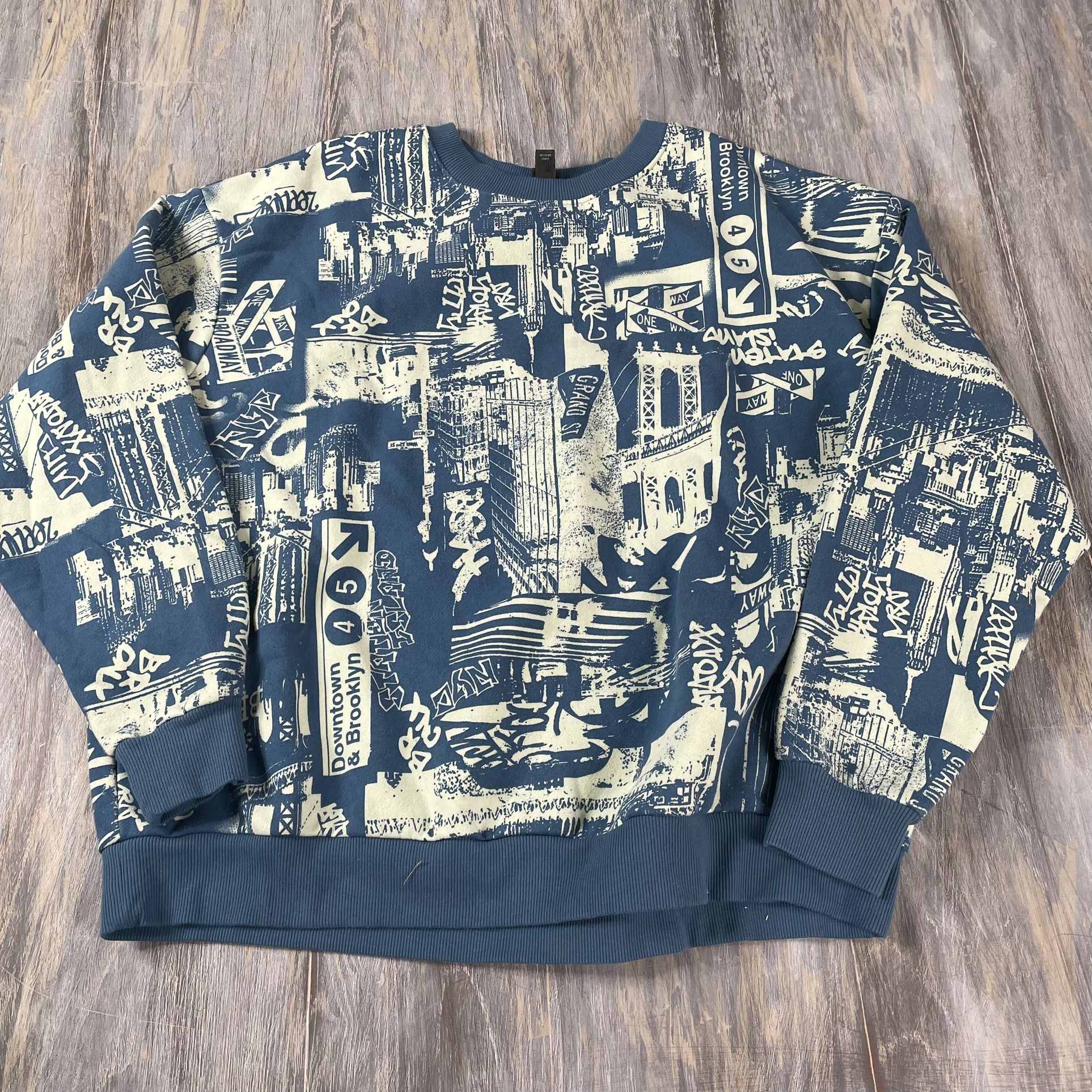 Wild Fable New York Sweater Womens Large All Over Print Streetwear Pullover Blue. Used condition. 25” long by 24” pit to pit. Sold exactly as pictured.