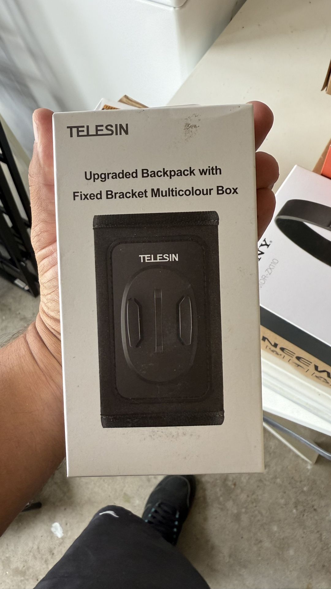 Brand new TELESIN backpack clip mount for GoPro or action cameras. Strong grip, adjustable, perfect for hiking, biking, travel vlogs, and POV recording. Never used.