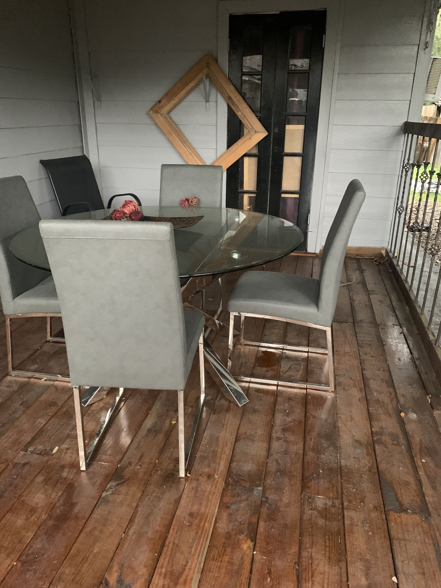 GLASS TABLE. NO. CHIPS. FOUR CHAIRS. VERY STURDY. NO RIPS. PRICED TO SELL