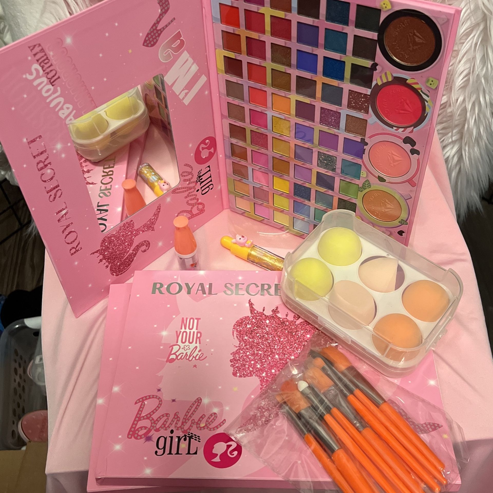 Eyeshadow palette, beauty blenders, brushes, lip gloss
