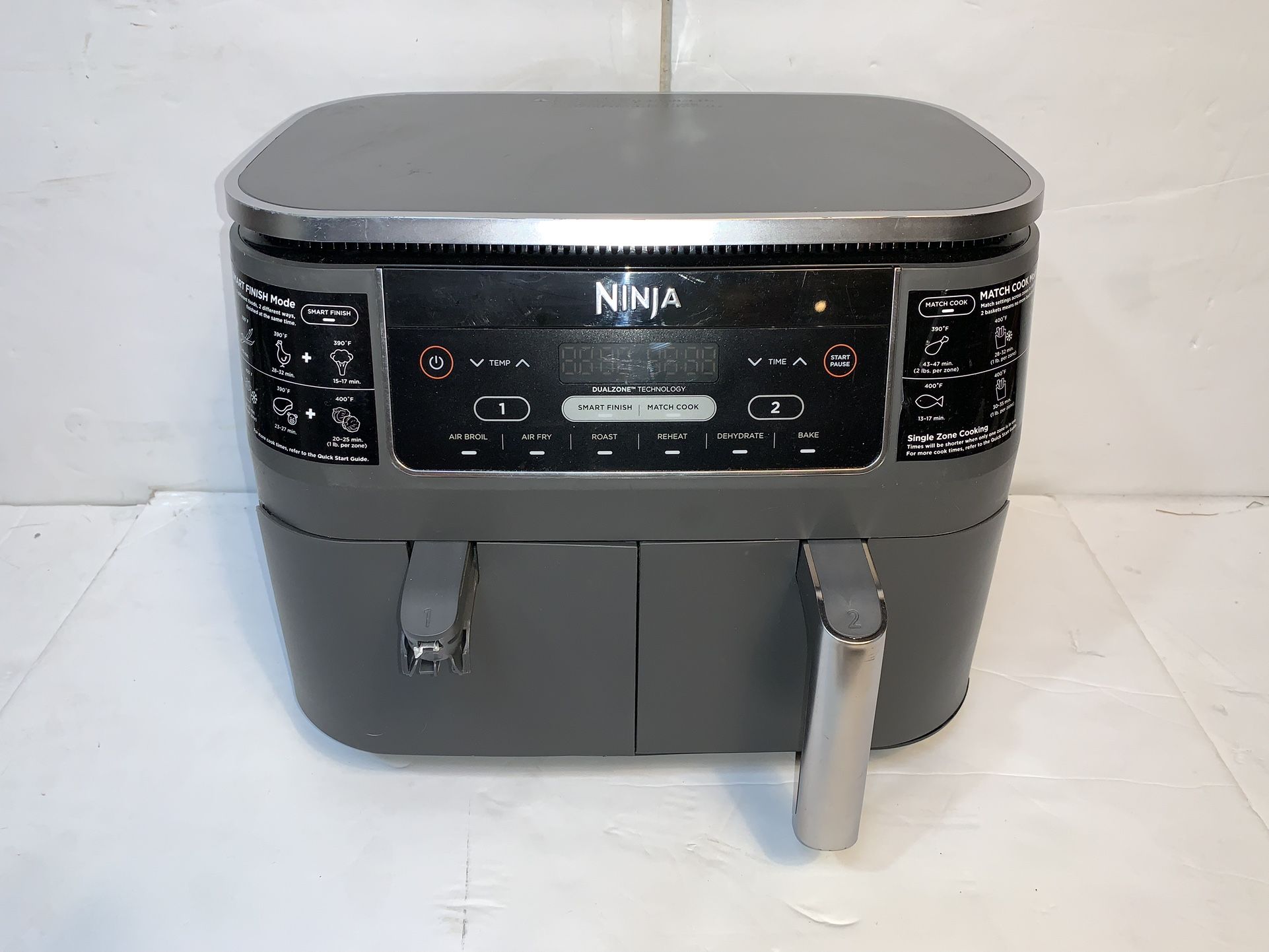 Ninja DZ201 Foodi 8 Quart 6-In-1 Dualzone 2-Basket Air Fryer Baskets Roast (broken handle) Condition info: This unit was originally from Best Buy and was an open box display item. It is unused and comes with all the original parts and manuals. May show signs of being on display in a retail store for a season.
