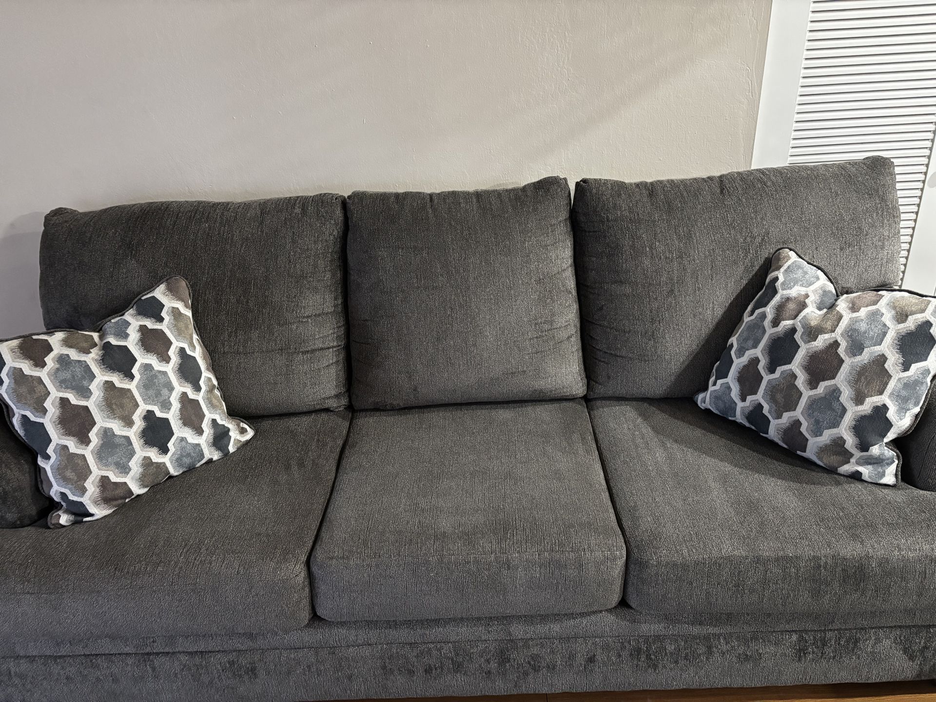 A gray sofa set including one three-seater and one two-seater. Made with high-quality material, fully washable, and in excellent condition with no tears or damage. Includes a matching rug set, free, available in various sizes.