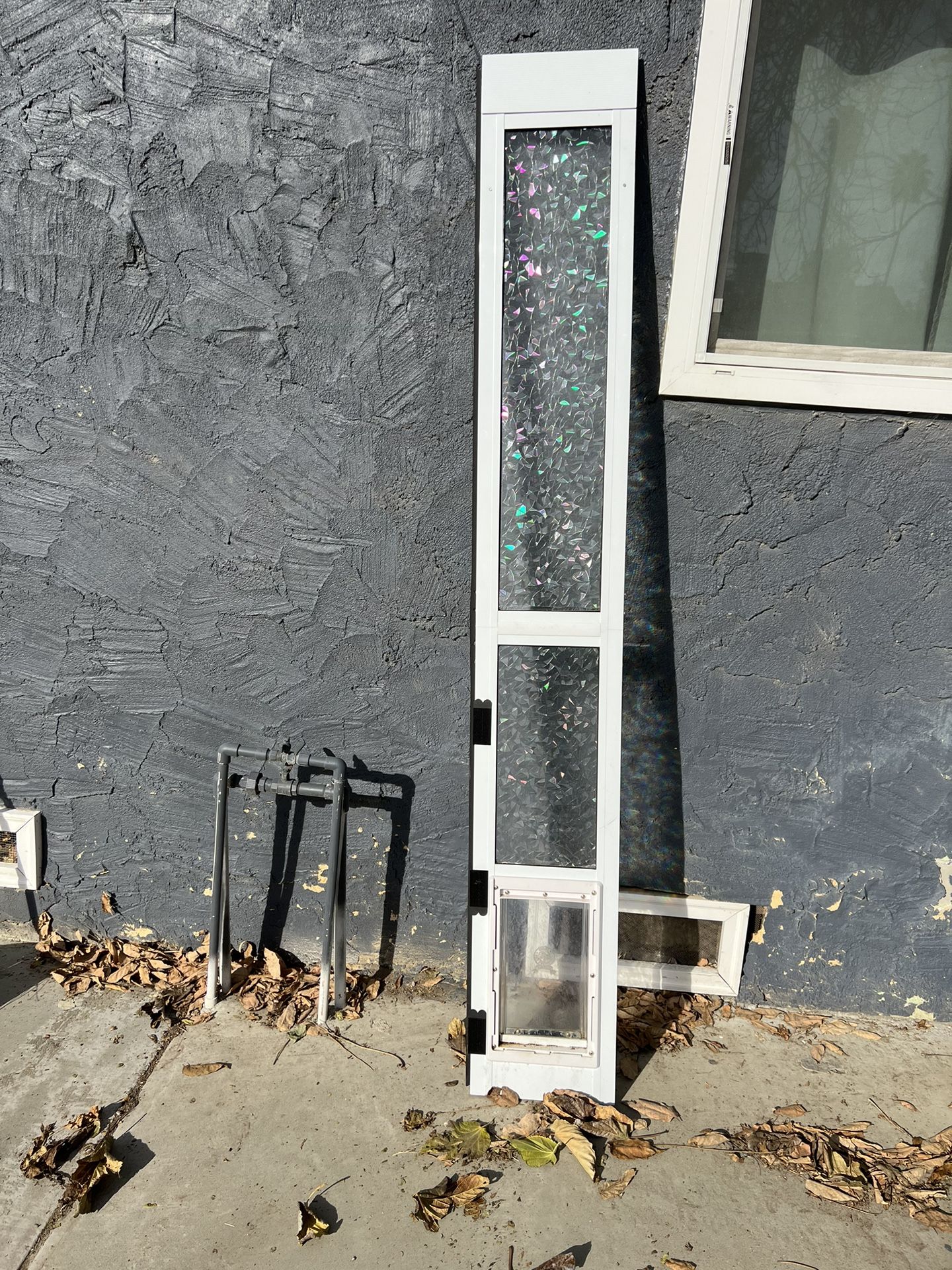 Dog door for sliding glass door, fits a small dog. It was a lifesaver in my apartment. The glass was originally clear, but I added removable privacy film. It cost 199 originally and is currently out of stock.