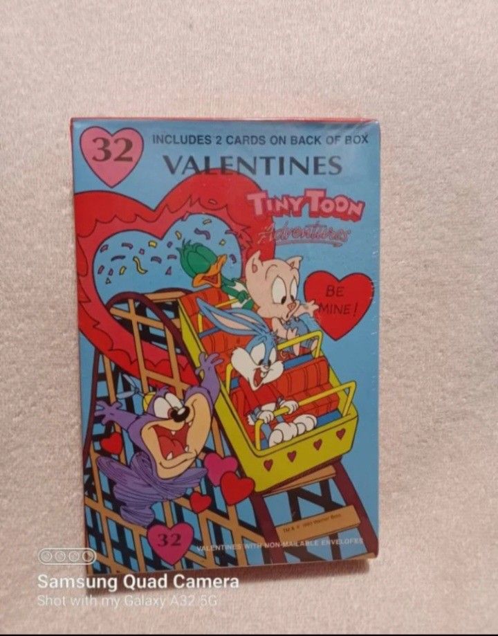 Colorful Tiny Toon Adventures Valentines cards . Features fun cartoon characters . Perfect for spreading love and joy . Package includes 32 Valentine cards & envelopes . Featuring tiny toon characters dizzy devil ( baby taz) , buster bunny ( baby bugs ) , Pulcky duck ( baby daffy duck) & Hamton J Pig ( baby porky pig ) . For kids, teachers & special friends . Gift idea for collectors and fans . Kept in the original factory sealed package . Made by Grand Award of the Paper Magic Group inc for Warner brothers in 1993